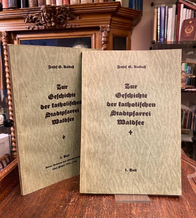 Waldsee, Bad. – Balluff, Joseph [Gustav]: Zur Geschichte der katholischen Stadtpfarrei Waldsee [in zwei Teilen]: Erster Teil: Einführung des Christentums in Oberschwaben, besonders in Waldsee und seiner Umgebung als Vorgeschichte. Zweiter Teil: Die Pfarrei Waldsee unter Leitung des regulierten Chorherrnstifts zu St.Peter in Waldsee vom Jahre 1181-1788. 2 Bände in 2 (alles Erschienene), Waldsee, Verlag der C.Liebel’schen Buchdruckerei Viktor Liebel, 1936. 8° (22x15), 94, 109 S., OKart (Brosch), Band 2 Schnitt und Titelblatt etwas fleckig, sonst fest und sauber,