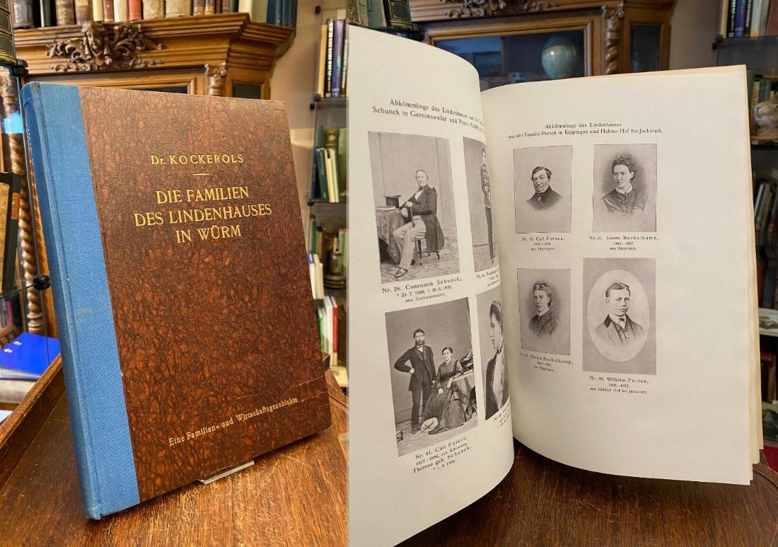 Kockerols, Justizrat [Karl]: Die Familien des Lindenhauses in Würm : Eine Familien- und Wirtschaftsgeschichte: I. Teil: Leiffarther Hof und Lindenhaus.– II. Teil: Das weitere Jülicher Land.– III. Familienleben, Nachkommen, Nachträge. 3 Teile in 1 Band, Görlitz O.-L., Verlag für Sippenforschung und Wappenkunde C.A. Starke (Inh. Hans Kretschmer), 1927. 4° (32x24), 204 S., mit Ansicht, zahlr. fotograf Porträts, genealogische Übersichten, OHln mit goldTitel, leicht gebräunt, fest sauber und gepflegt,