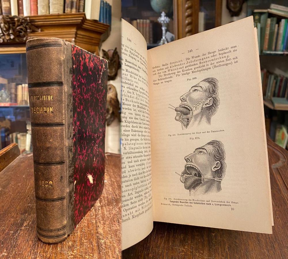 Esmarch, Friedrich von / Kowalzig, Ernst: Chirurgische Technik : Ergänzungsband zum Handbuch der kriegschirurgischen Technik enthaltend die übrigen Operationen. 2., unveränderte Aufl., Kiel und Leipzig, Lipsius und Tischer, 1892. 8° (20x14), VIII, 372 S.,mit 520 Holzschnitten, marmor Hldr d.Zt. mnit goldRTitel, marmorVorsätze, Leder etwas berieben/entfärbt, Kanten etwas bestossen, innen fest sauber und gepflegt,