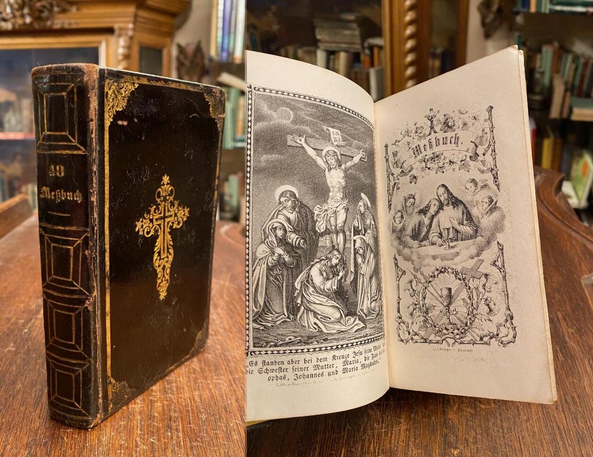 Weltlicher Leute Messbuch, enthaltend: vierzig sehr kräftige, andächtige und herzliche Messandachten, …, nebst gewöhnlichen Andachtsübungen. 23., umgearbeitete, verbesserte und vermehrte Aufl., Einsiedeln, New-York; Cincinnati, Gebr. Karl und Nikolaus Benziger, 1862. 12° (15x10), 392 S., 2 Bl., mit Frontispiz und illustriertem Vortitel, Ldr d.Zt. mit allseitiger goldPräg, goldSchnitt (dieser etwas verblasst), teils etwas braunfleckig, genutztes, aber pfleglich behandeltes Exemplar,
