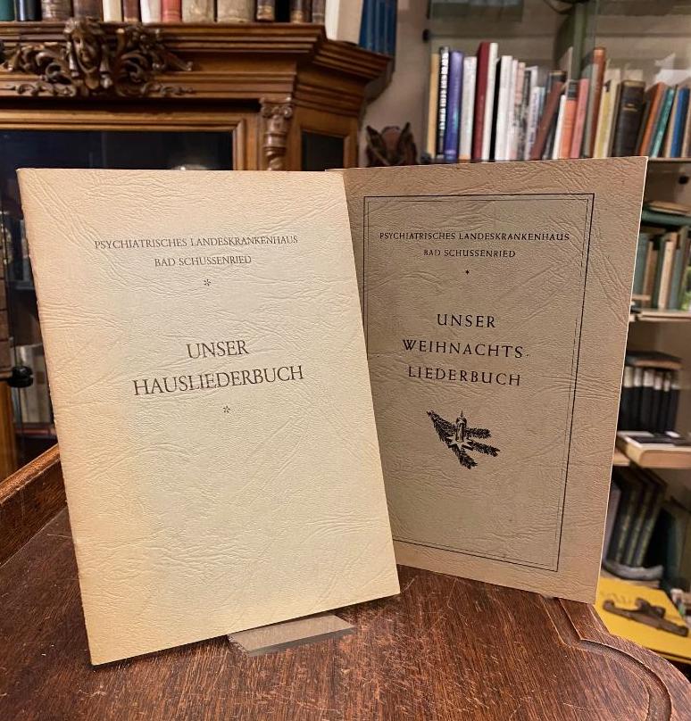 Psychiatrisches Landeskrankenhaus Bad Schussenried: Unser Hausliederbuch [und] Unser Weihnachtsliederbuch. Bad Schussenried, PLK, i.J. [um 1980]. 8° (21x15), (IV), 20; 15 S., OKart (Brosch), 2 Hefte mit Titeldruck, etwas lichtverfärbt, gering fleckig, ordentliche Exemplare, ohne Melodien.–