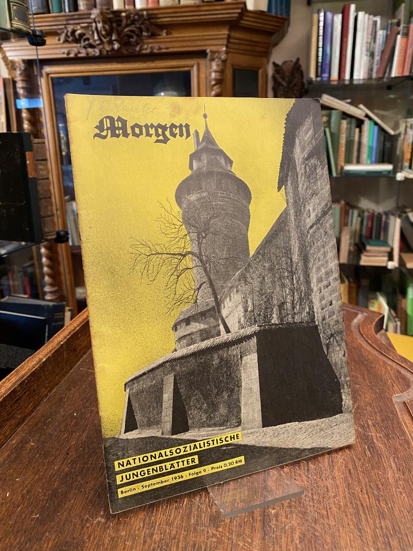 Reichsjugendführung Abtl. P (Hrsg) / Fischer, Erich (Schriftl) / Reinecker, Herbert (Zst): Morgen : Nationalsozialistische Jungenblätter : 2. Jg. (1936) Folge 9 : Berlin, September 1936. Berlin, Deutscher Jugendverlag, 1936. 4° (25x17), 29, (3) S., reich illustriert, ill OKart (Brosch), Name auf Umschlag, Umschlag stockfleckig/braunfleckig, fest und sauber, Hinweis auf §86a StGB: Abgabe nur zu Zwecken der staatsbürgerlichen Aufklärung, der Abwehr verfassungsfeindlicher Bestrebungen, der wissenschaftlichen und kunsthistorischen Forschung, der Aufklärung oder Berichterstattung über die Vorgänge des Zeitgeschehens oder der militärhistorischen und uniformkundlichen Forschung. Der Käufer bestätigt mit seiner Bestellung ebenfalls, Bücher mit Emblemen des Dritten Reiches nicht zu propagandistischen Zwecken zu verwenden. —