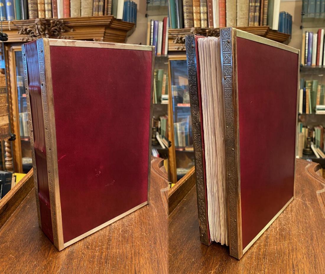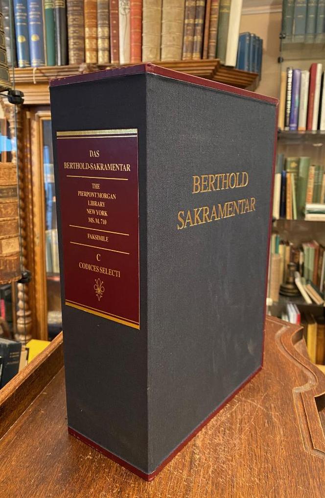 Berthold-Sacramentar. – Das Berthold-Sakramentar : Vollständige Faksimile-Ausgabe der Handschrift Ms. M. 710 der Pierpont Morgan Library New York. FAKSMILIE + KOMMENTAR herausgegeben von Felix Heinzer und Hans Ulrich Rudolf. Graz, ADEVA : Akademische Druck- und Verlagsanstalt, 1995-1999. 4° (30x21), FAKSIMILE: Ledereinband mit 164 Doppelseiten mit ganz- und halbseitigen Miniaturen, teils figürliche Initialen; KOMMENTAR: Oln, 286 S., mit Abb., Faksmilie-Lederband beidseitig mit ornamental verzierten Metallschienen eingefasst (diese etwas oxidiert) in Leinenschuber mit Ledereinfassungen Rückenschild und goldDeckeltitel, vorderDeckel des Faksimile mit minimaler Druckstelle, auf dem Vorsatz wurde eine Postkarte mit dem Originaleinband mit Tesa (!) einmontiert, sonst sehr schöner gepflegter Zustand, die Leinenkassette vorderseitig schwach angeschmutzt, Vollständige Faksimile-Ausgabe im Originalformat des Berthold-Sakramentars : Volumen C der Reihe Codices Selecti.– nummeriertes Exemplar 45 von 280 Exemplaren der Verkaufsauflage (GA 330).– Gesamtherstellung: ADEVA, Graz, Aufnahmen: David A. Loggie, New York, Druck: Print & Art, Graz, Vergoldearbeiten: Mayer, Stuttgart, Buchbindearbeiten: Gutmann, Fernitz.–