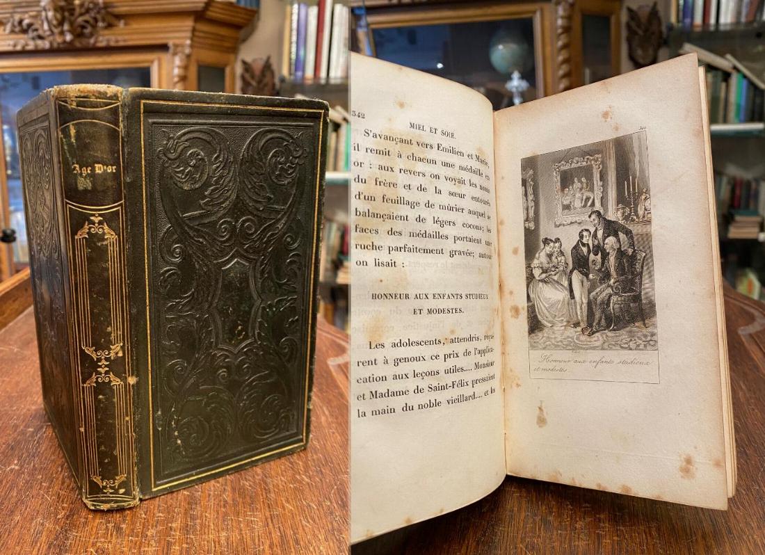 Dubois de Thainville, A. (Mlle): Age d’Or : Contes et Portraits. Sens, Thomaas-Malvin, 1838. 8° (18x11), 387, (2), 12 p., avec 10 planches gravures sur cuivre, reliure d’epoche plein cuir avec gaufrage a l’aveugel et dos dore, tranches dorees, pages en tete marbrees, avec rousseurs, sinon ferme et propre,