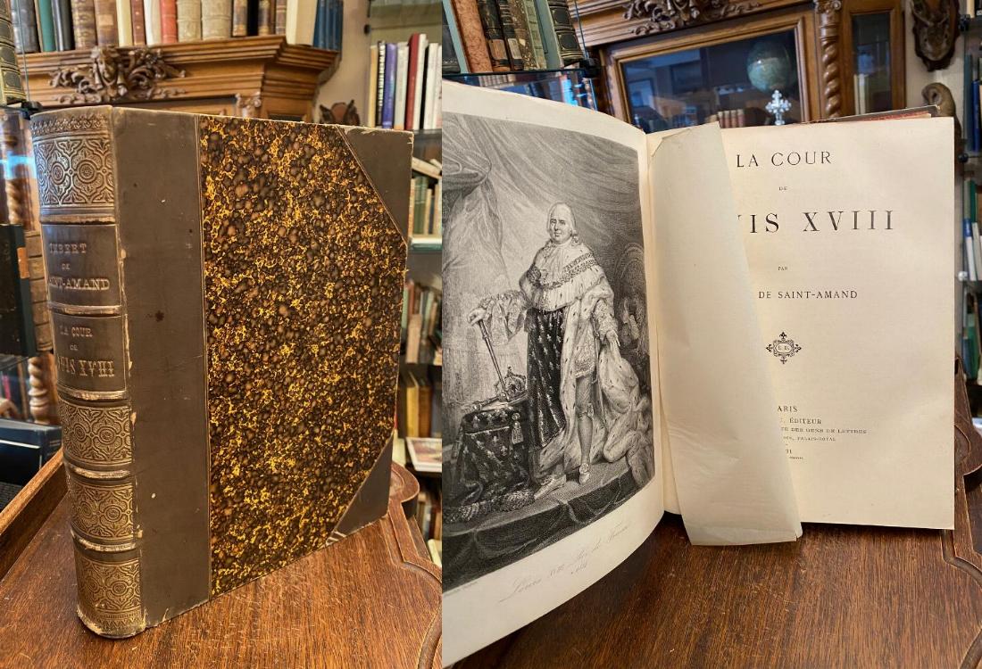 Imbert de Saint-Amand, [Arthur-Leon]: La Cour de Louis XVIII. Paris, E. Dentu Editeur : Libraire de la Societe des Gens de Lettres, 1891. 4° (32x25), 568 p., nombreuses illusgtration sur planches, partiellement gravures sur cuivre, reliure d’epoche, dos dore, tranche dorees, bords cogne, peu frotte,