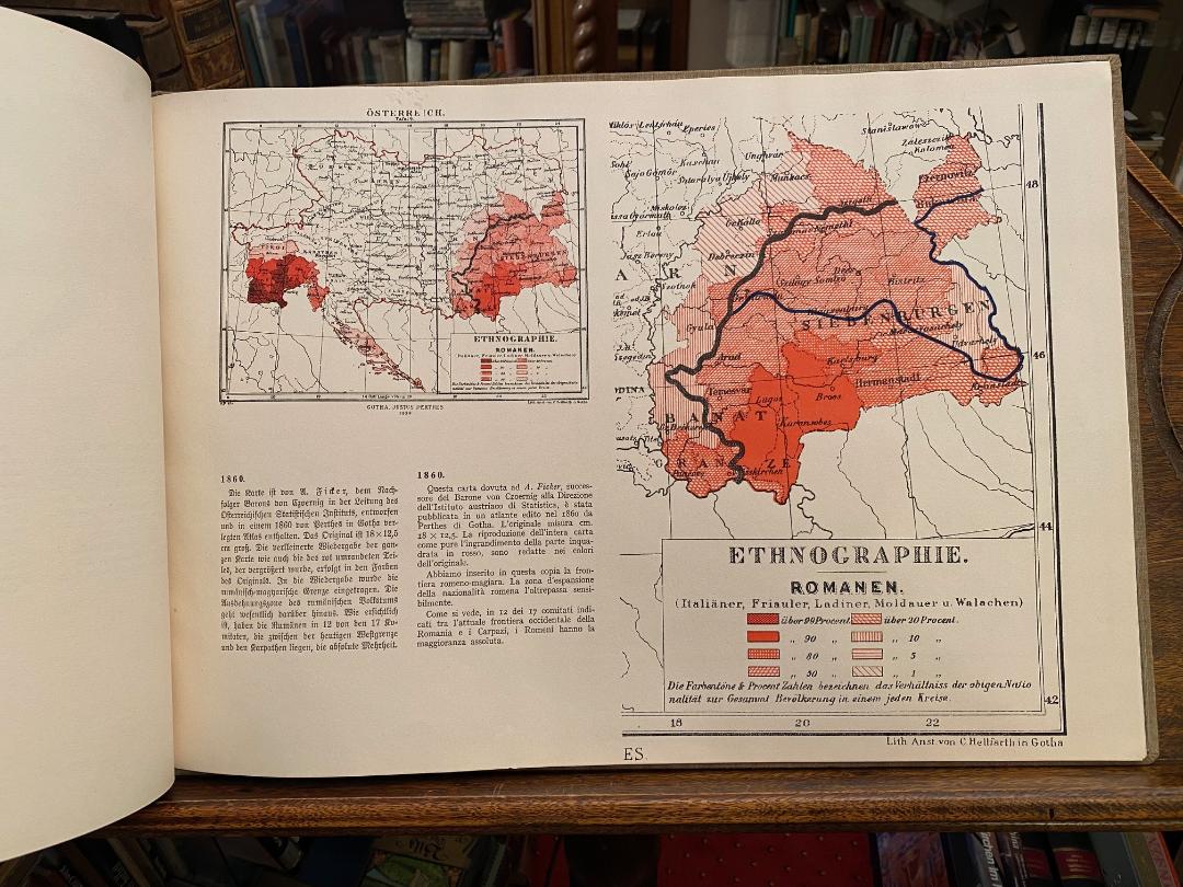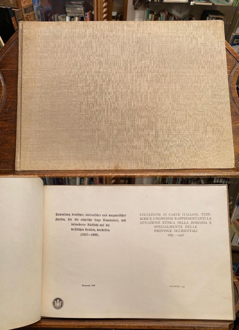 Sammlung deutscher, italienischer und magyarischer Karten, die die ethnische Lage Rumäniens, mit besonderer Rücksicht auf die westlichen Gebiete, darstellen (1857 – 1930) / Collezione di carte Italiane, Tedesche e Ungheresi rappresentanti la situazione etnica della Romania e specialmente delle province occidentali (1857 – 1930). Bucuresti [Bucarest], 1940. gr2° / gr Foliio (35 x 49), 2 Bl. (Titel und Einführung), 12 Kartenblatt (Karten mit erklärenden Texten), schlichter Leineneinband der Zeit, etwas staubrandig, sauber und gepflegt, aus der Bibliothek Schloss Altshausen mit Papiersiegel-Exlibris von Robert Herzog von Württemberg