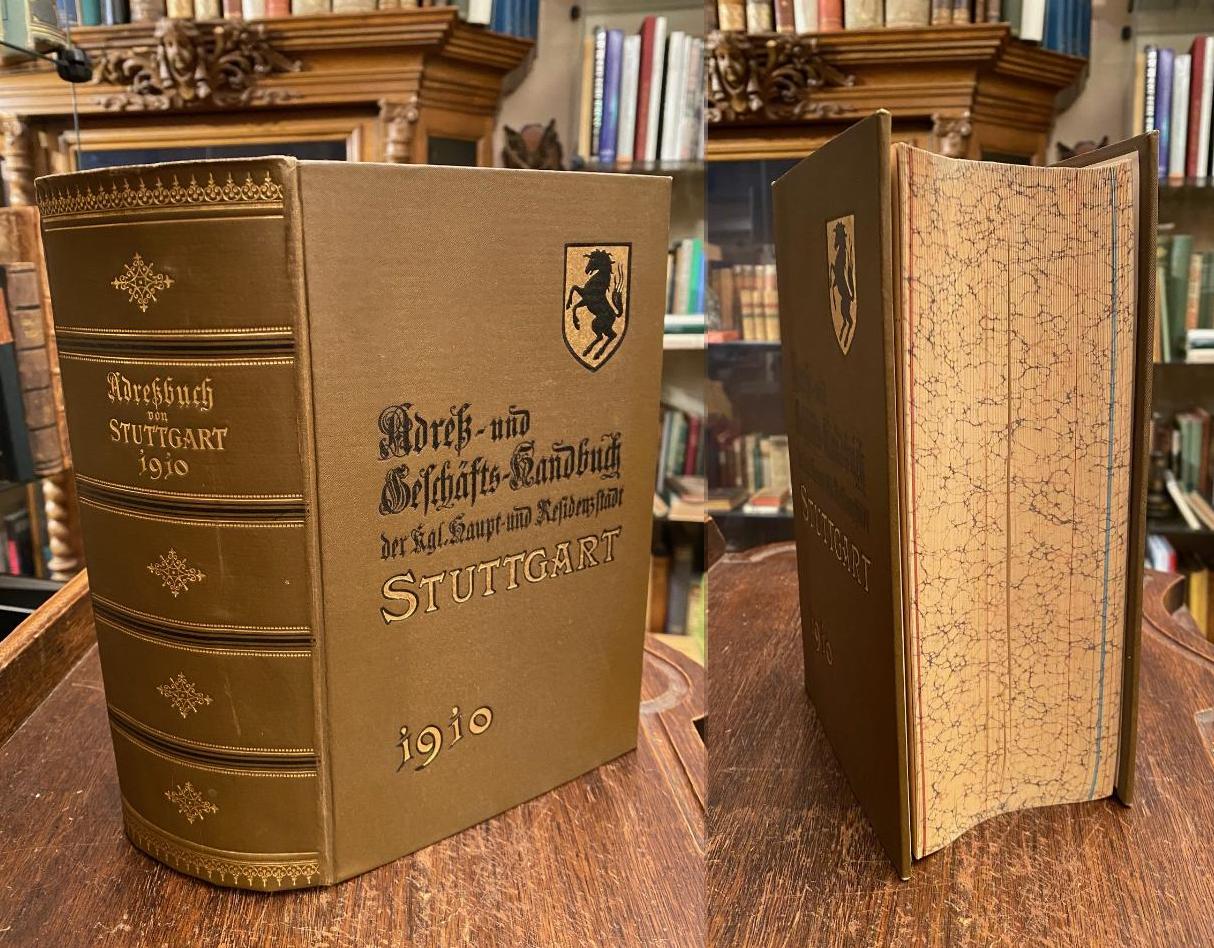 Stuttgart. – Adressbuch 1910. – Adress- und Geschäfts-Handbuch der Königlichen Haupt- und Residenzstadt Stuttgart, mit dem Stadtbezirk Cannstatt, dem Stadteil Ostheim, der Vorstadt Berg, der Karlsvorstadt Heslach, den Vororten Gablenberg und Gaisburg, der Vorstadt Untertürkheim und den Vororten Wangen und Degerloch für das Jahr 1910. Herausgegeben von der Stadtgemeinde Stuttgart. Mit einer Orientierungskarte von Stuttgart und Umgebung, einem Plan von Stuttgart mit Cannstadt, sowie Untertürkheim und Wangen und drei Theaterplänen : In drei Teilen. Stuttgart, Druck der UDV Union Deutsche Verlagsgesellschaft, (1910). 8° (23x16), 3 Bl. (Bestellkarten/Kalendarium/Titel), XXIX, 828, 1074, 262 S., 1 doppelseitiger farb Stadtplan, 3 doppelseitige Theaterpläne, 2 mehrfach gefaltete farb Karten in Deckeltasche [so komplett], brauner Oln gewachst mit schwarz- und goldPrägung, tadelloses frisches Exemplar ohne Gebrauchsspuren, aus der Bibliothek Schloss Altshausen mit Papiersiegel-Exlibris von Robert Herzog von Württemberg