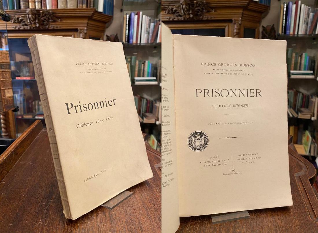 Bibesco, Prince Georges: Prisonnier : Coblence 1870 – 1871. Avec une carte et 3 gravures dans le texte. Paris, E. Plon, Nourrit & Cie / Bale & Geneve, Librairie Georg & Cie, 1899. gr8° (24x16), 216 p., ave 1 carte page-double, et 3 planches hors texte (Ehrenbreitstein, distribution des lettres, dessin phototypique du cheval Sanglier), reliure d’editeur souple, non rogne, bon etat propre, Provenance: bibliotheque duchesse de chateau Altshausen avec exlibris de Robert Duc de Wurtemberg.–