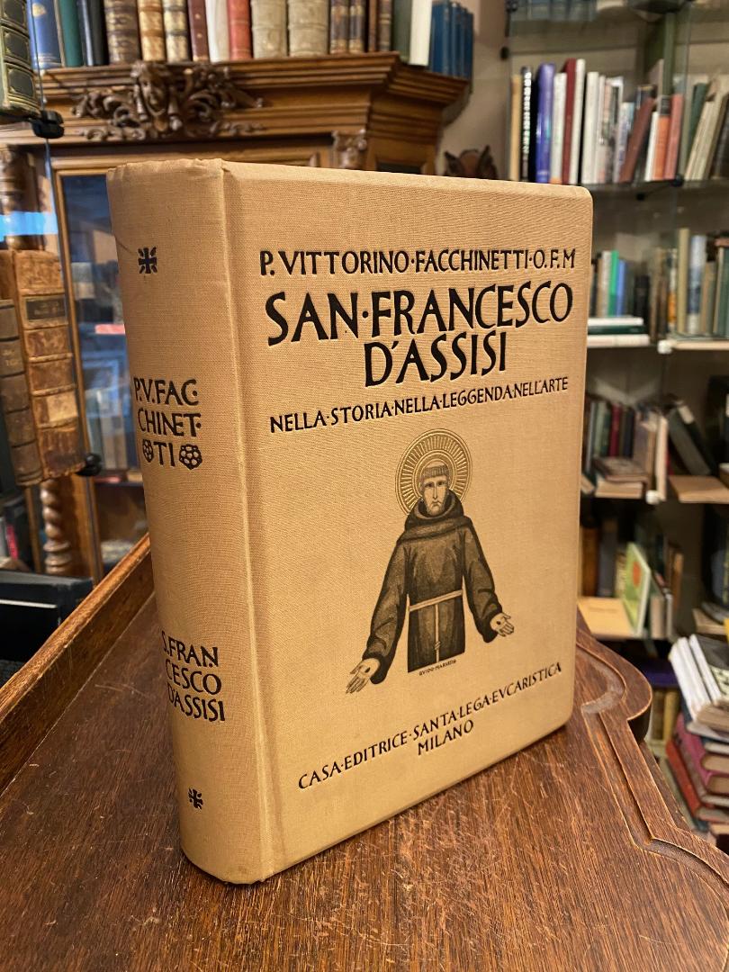 Assisi, Franz von. – Facchinetti OFM, Vittorino: San Francesco d’Assisi : Nella Storia – Nella Leggenda – Nell’Arte. 2. edizione arricchita e migliorata, Milano, Casa Editrice S. Lega Eucaristica, 1926. 4° (28x20), XLVIII, 739 p., riccamente illustrato, legatura editoriale tela illustrata, taglio di testa in oro, bella copia ordinata, exemplare numero 1617 dell’edizione deluxe