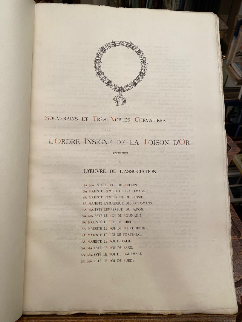 Tulpinck, Camille (ed): Les Chef-d’Oeuvre de l’Art Flamand a l’Exposition de la Toison d’Or. Etudies par un Groupe de Savants sous la Direction de Camille Tulpinck, President de l’Association. Bruges, Siege de l’Association, 1908. gr4° / gr folio (49x32), 108, (1) p., 25 planches hor textes avec des illustrations montees, reliure d’editeur rigide avec papier pergamin, la couverture sensible, legerement abimee et jauni, bon exemplair exeptionnel, exemplaire de la bibliotheque du chateau d’Altshausen.– relie devant une liste des souverains et tres nobles chevaliers de l’Ordre de la Toison d’Or et une feuille de dedicace personelle pour le Duc Albert de Wurtemberg.–