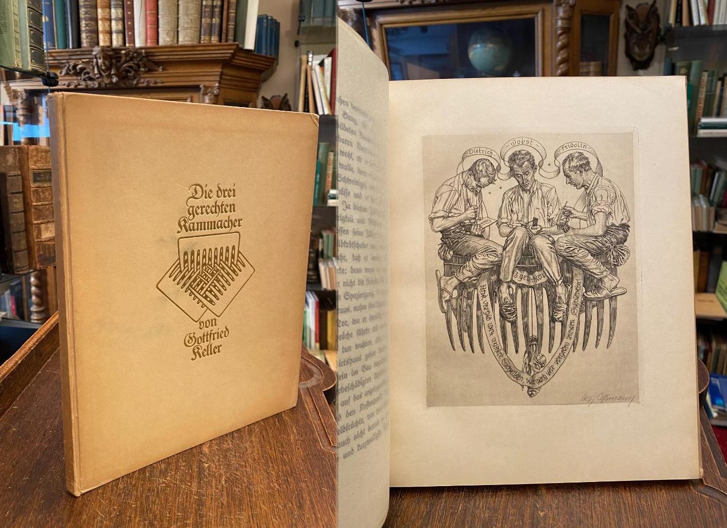 Cossmann, Alfred (1870-1951). – Keller, Gottfried: Die drei gerechten Kammacher. Mit sechs Originalradierungen von Alfred Coßmann. Wien, Verlag der Gesellschaft für vervielfältigende Kunst, 1915. 4° (28x22), 54 S., mit 6 Original-Radierungen jeweils handsigniert, OPbd mit goldPrägung, SchmuckVorsätze, etwas lichtrandig, Ecken minimal bestossen, 2 zarte Schutzpapiere mit leichtem Knitter, schönes gepflegtes Exemplar, Alfred Cossmann (1870-1951).– Wiener Kupferstecher und Radierer, Exlibriskünstler.–