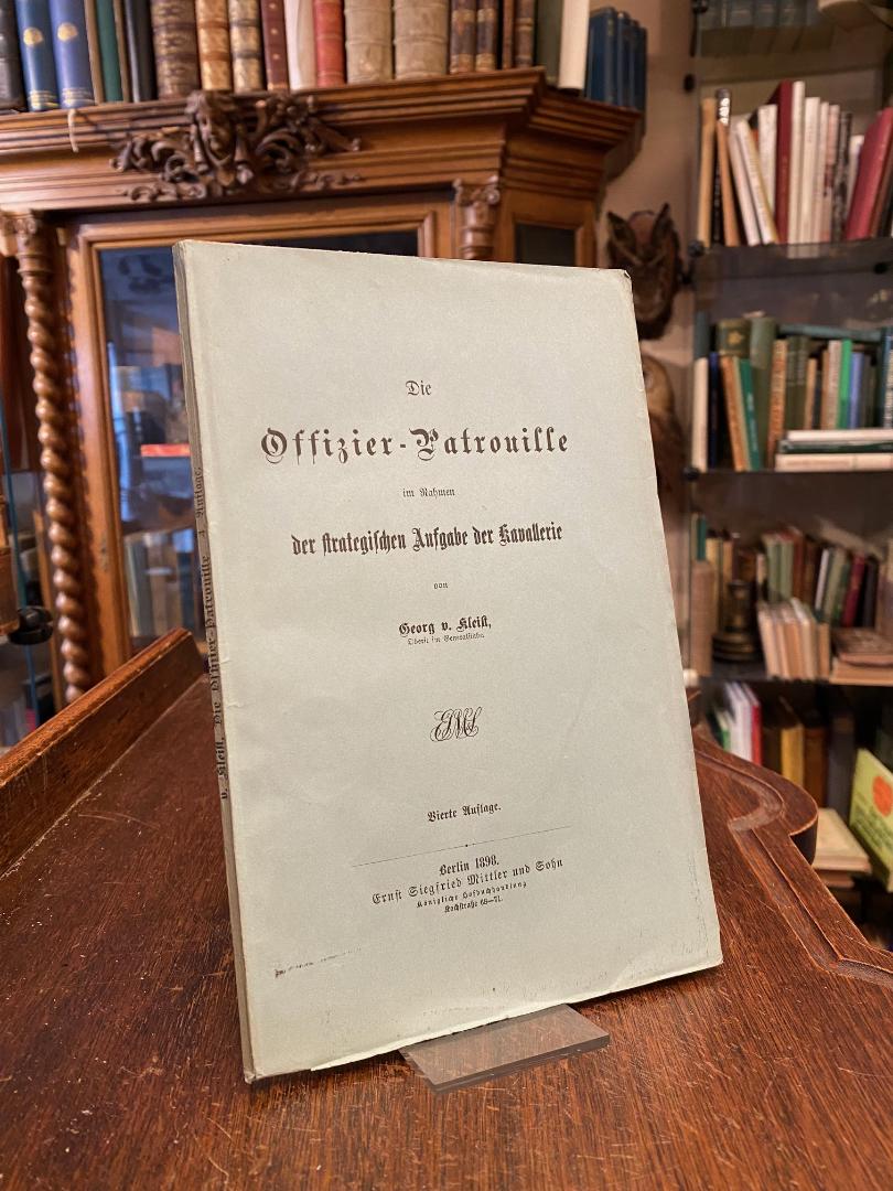 Kleist, Georg von (Oberst im Generalstab): Die Offizier-Patrouille im Rahmen der strategischen Aufgabe der Kavallerie. 4. Aufl., Berlin, Ernst Siegfried Mittler und Sohn : Königliche Hofbuchhandlung, 1898. 8° (23x15), VI, 81 S., OKart (Brosch), fest sauber und gepflegt, aus der Bibliothek Schloss Altshausen mit Papiersiegel-Exlibris von Robert Herzog von Württemberg.–