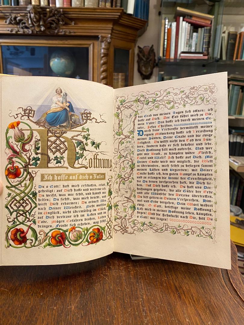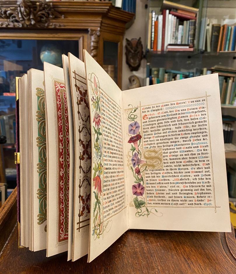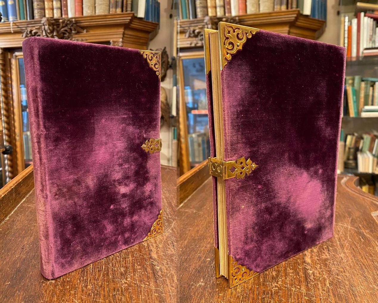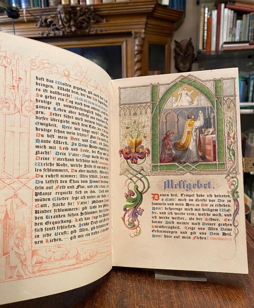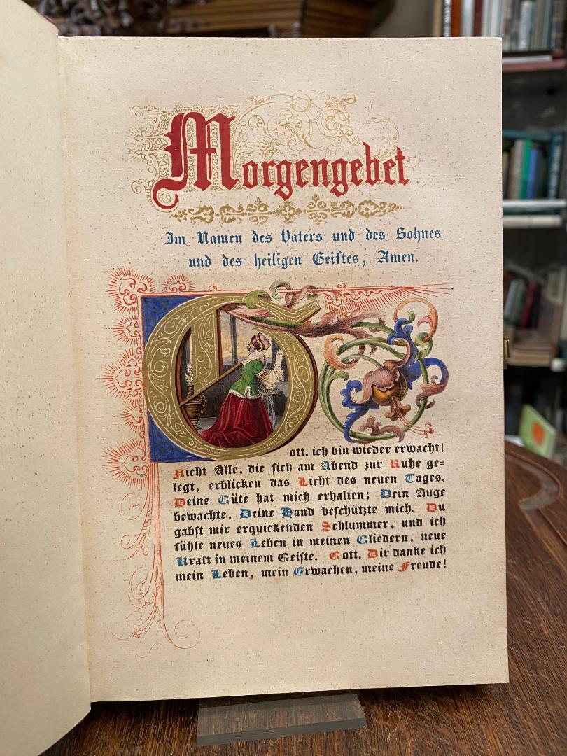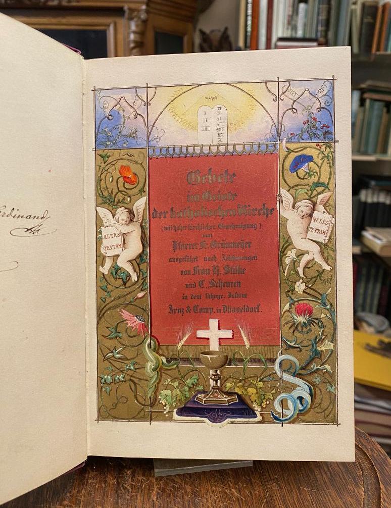 Grünmeyer, Franz (1802-1871) / Silke, Hermine (1804-1869) / Scheuren, Caspar (1810-1887): Gebete im Geiste der katholischen Kirche (mit hoher kirchlicher Genehmigung) von Pfarrer Fr. Grünmeyer, ausgeführt nach Zeichnungen von Frau H. Silke und C. Scheuren in den lithogr. Institut Arnz & Comp in Düsseldorf. Düsseldorf, Arnz & Comp, [1842]. 8° (21x14), 1 w Bl., 1 Titelblatt 1 w Bl., [160] S., 1 w Bl., [2] S. Inhaltsangabe/Druckvermerk, durchgehend farbig lithographiert in unterschiedlichsten Schmuckrahmen, farbige Textinitialen und Illustrationen in Gold-, Silber- und Farbendruck in Manier einer mittelalterlichen Handschrift, violetter Samteinband mit vergoldeter durchbrochen gearbeitet und ziselierter Schließe und beidseitig Eckbeschlägen, dreiseitiger goldSchnitt, SeidenMoireeVorsätze, sehr schönes Exemplar in Pappkassette, [Rümann, Die illustrierten deutschen Bücher des 19. Jahrhunderts; 2192].–