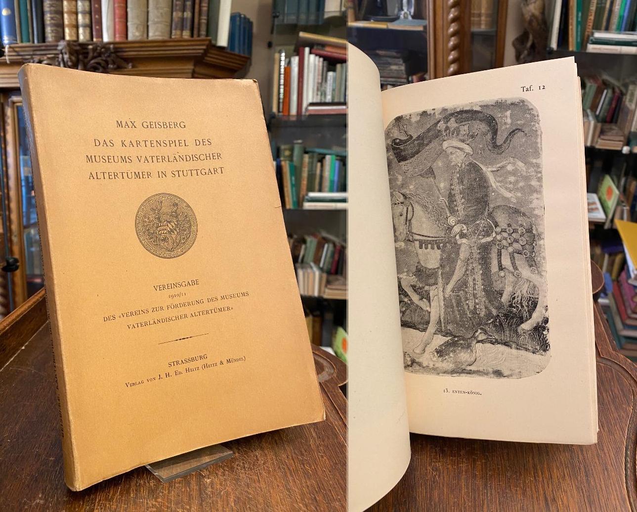 Geisberg, Max: Das Kartenspiel des Museums vaterländischer Altertümer in Stuttgart. Vereinsgabe 1910/11 des ‚Vereins zur Förderung des Museums vaterländischer Altertümer‘. Strassburg, Verlag von J. H. Ed. Heitz (Heitz & Mündel), [1911]. 4° (25x17), 48 S. + 49 Lichtdrucktafeln, OKart (Brosch), etwas angestaubt, unbeschnitten/unaufgeschnitten, offensichtlich ungelesen, deutsches Kartenspiel des XV. Jahrhun.–