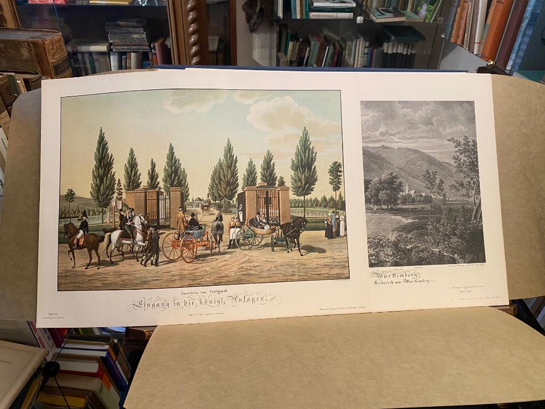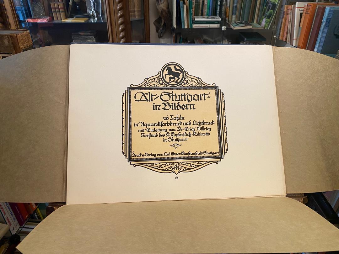 Stuttgart. – Willrich, Erich (Einl): Alt-Stuttgart in Bildern : 26 Tafeln in Aquarelldruck und Lichtdruck mit Einleitung von Dr. Erich Willrich, Vorstand des K. Kupferstich-kabinetts in Stuttgart. Stuttgart, Druck und Verlag von Carl Ebner : Kunstanstalt, [1912]. gr2°quer / gr Folio quer (34x51), 2 Bl. (Text/Inhalt), 26 teils farb Tafeln [so komplett], blaue Oln-Mappe mit goldTitel, etwas angestaut, Blätter sauber und gepflegt, Mappe und Einzelblätter aus Doublette auf Anfrage.–