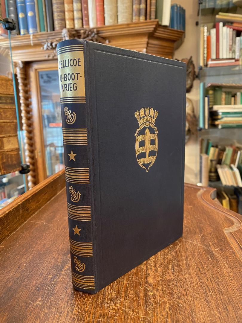 Jellicoe, [John] Lord / Spiess, Johannes (Üb): Der U-Boot-Krieg : Englands schwerste Stunde. Berlin, Vorhut Verlag Otto Schlegel, [1938]. 8° (22x15), 229 S., 1 Bl., mit 13 fotograf Aufnahmen, 2 Kartenskizzen, 1 mehrfach gefaltete Übersichtskarte, blauer Oln gewachst mit goldPrägung, nahezu ungelesen, schönes gepflegtes Exemplar,