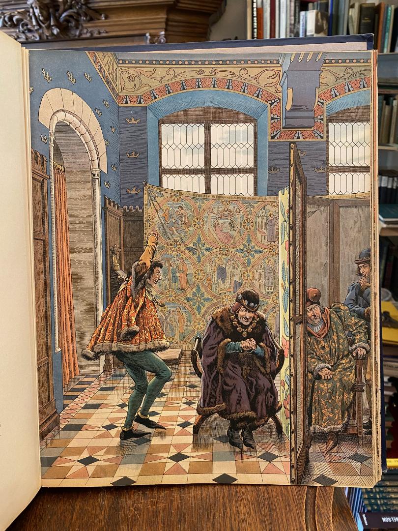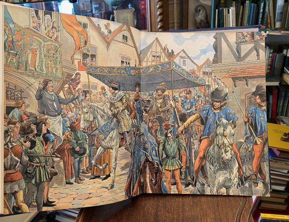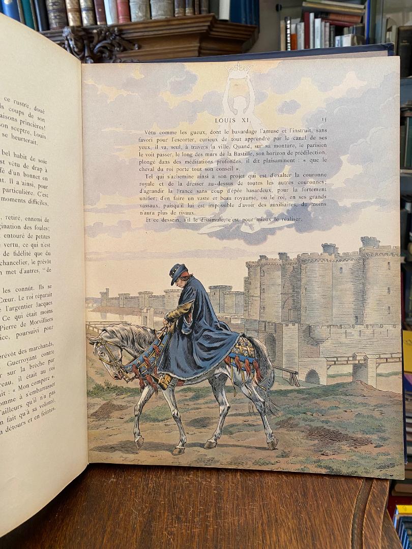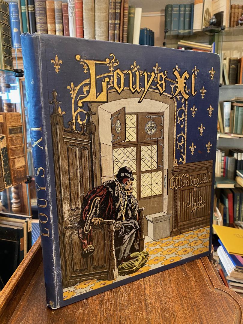 Louis XI. (1423-1483) (1494-1547). – Job (c’est-a-dire Jacques Onfroy de Breville (1858-1931] (ill) / Montorgueil, Georges (texte): Louis XI. 1. ed., Paris, Ancienne Librairie Furne : Combet & Cie Editeur, 1905. 4° (37x30), iv, 78, (2) p. montees sur onglets, avec gravures plein et double page, reliure d’editeur en toile bleue avec illustration colorees en relief, tranches dorees, reliure legerement tachee, peu frotte, petite reparations aux articulations, bel exemplaire soigne, [= Collection d’Albums Historiques : Illustre d’Aquarelles en Chromotypogravure], [vgl. Schug, Bilderwelt 2632-2636].–