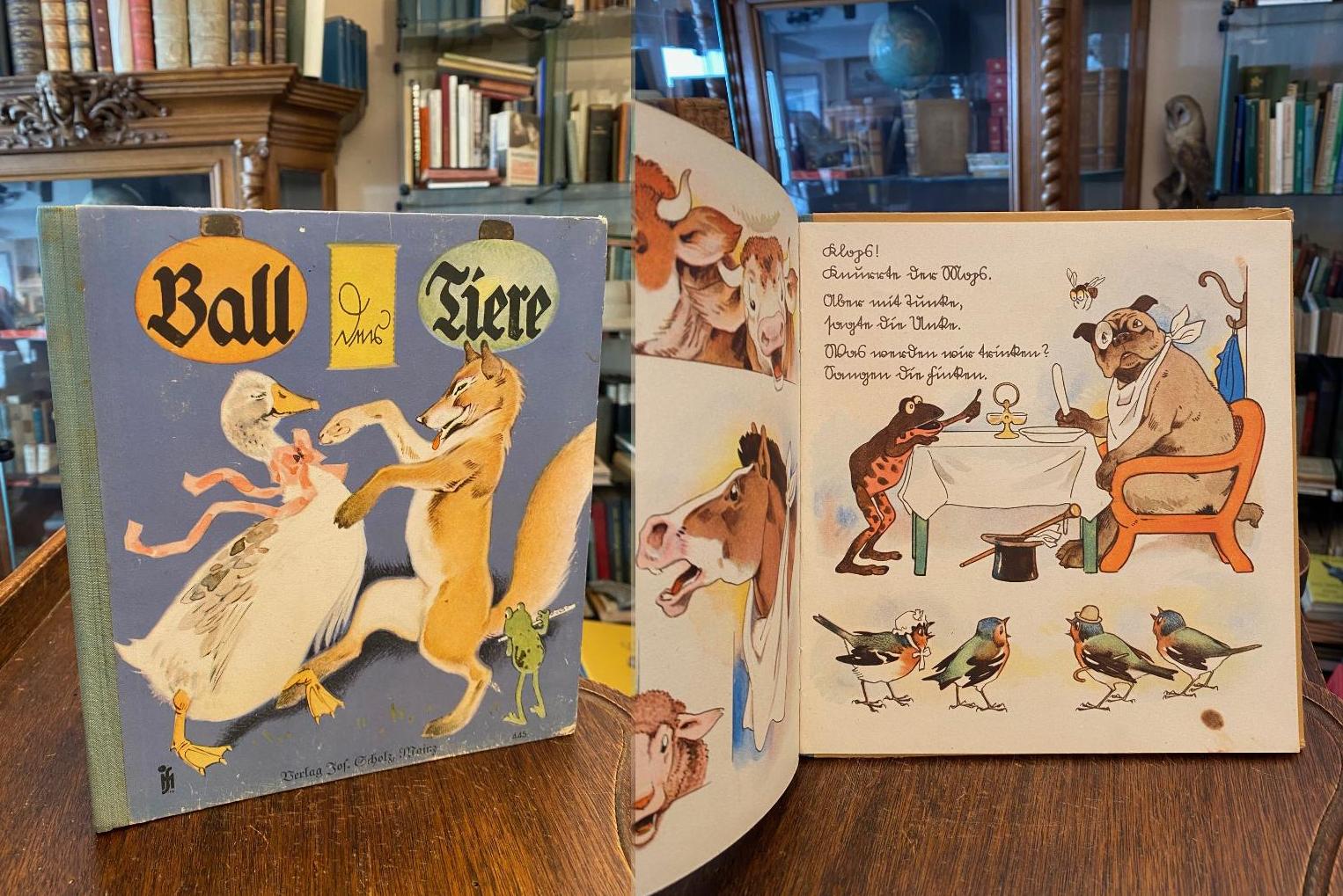 Baumgarten, Fritz: Ball der Tiere : Eine altbekannte Reimegeschichte mit neuen Bildern von Fritz Baumgarten. (1. Aufl.), Mainz, Verlag Jos. Scholz, [1937]. 4° (26x23), [20] S., farb illustriert mit begleitenden Versen, illustrierte Vorsätze, farb ill OHln, Rückenleinen etwas angestaubt, gering berieben, 2 Blatt mit kleinem Fleckchen, schönes gepflegtes Exemplar, [= Verlags-Nummer 445], ’Wir geben einen Ball / sagte die Nachtigall / Ich bin dabei schnarrte der Papagei / Horch! Horch! / klapperte der Storch …