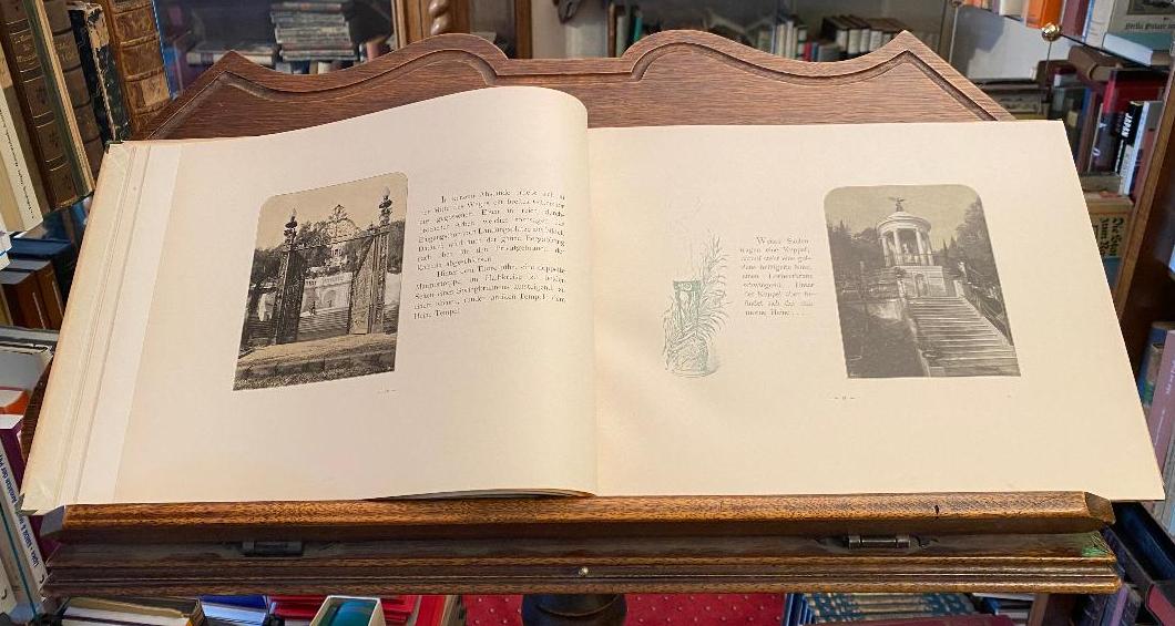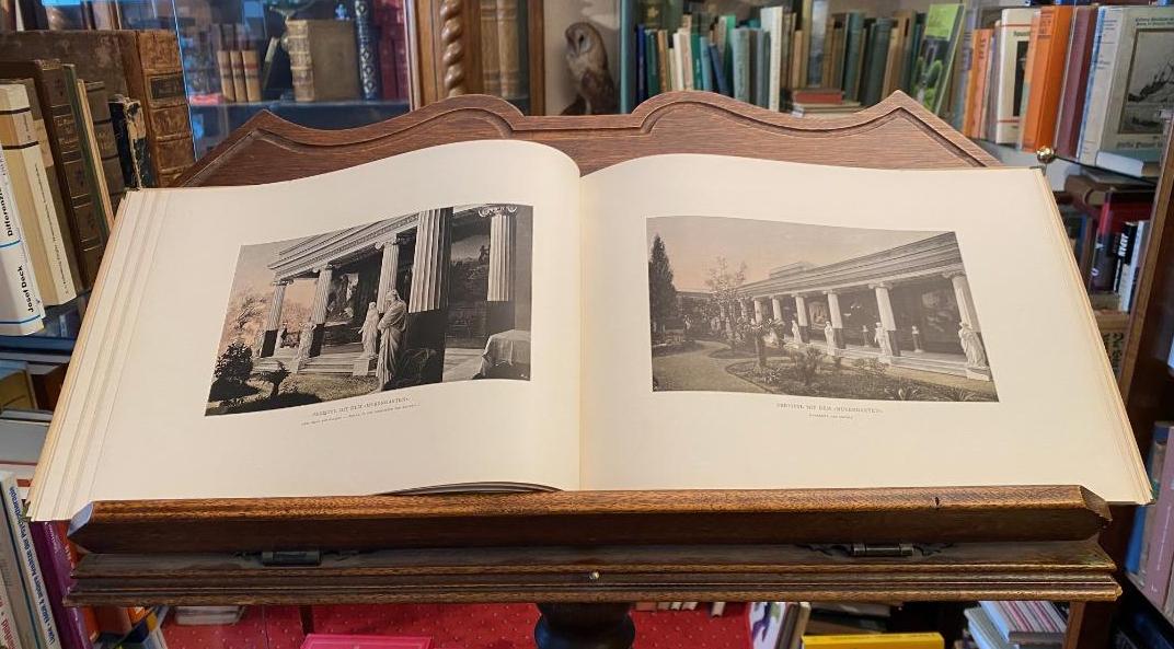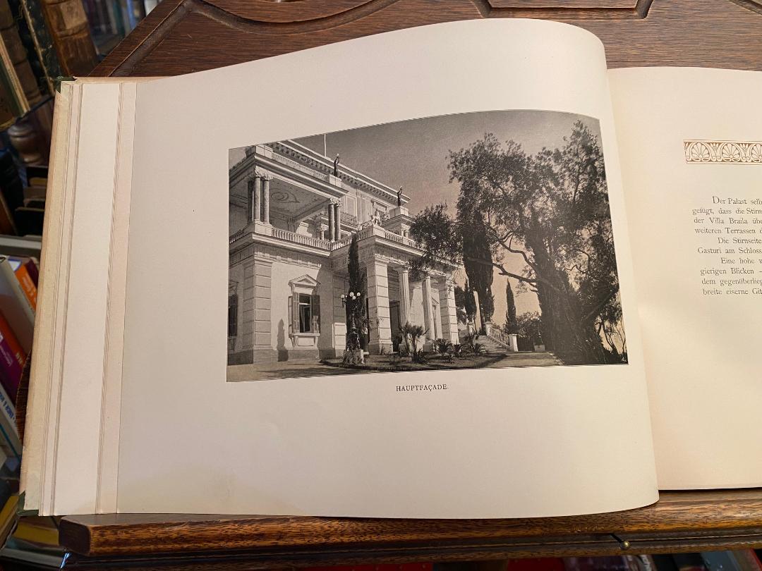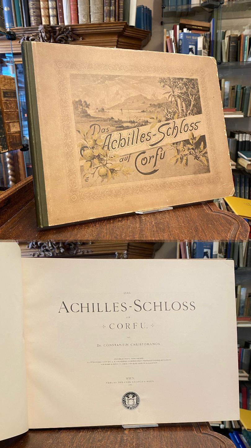 Christomanos, Constantin: Das Achilles-Schloss auf Corfu. Wien, Verlg von Carl Gerold’ Sohn, 1896. 4° (25x33), 64 S., 1 Bl., mit zahlr. fotograf Aufnahmen im Text und auf 13 Tafeln, geschmückt von Bordüren und Vignetten, ill OHln, Einband berieben und an den Kanten bestossen, sonst fest sauber und gepflegt, Umschlag von L. Hans Fischer.– Illustrationen nach mit A. H. Erlaubniss angefertigten photograpischen Aufnahmen von Borri & Figlio in Corfu und Alois Beer in Klagenfurt.–