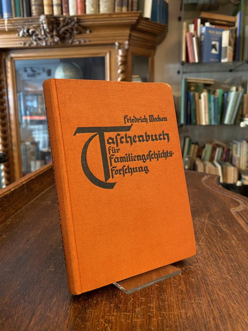 Wecken, Friedrich: Taschenbuch für Familiengeschichtsforschung. Mit einem Geleitwort von Ludwig Finckh. 5. Aufl., Leipzig, Degener & Co : Inh. Oswald Spohr, 1937. kl8° (16x12), 244 S., Deckeltasche mit Jahreskalender und Schablone, oranger Oln mit Titelprägung, angestaubt, Name auf Vorsatz, sonst fest und sauber, mit zeittypischen Kapiteln zu Juden und Zigeunern.–