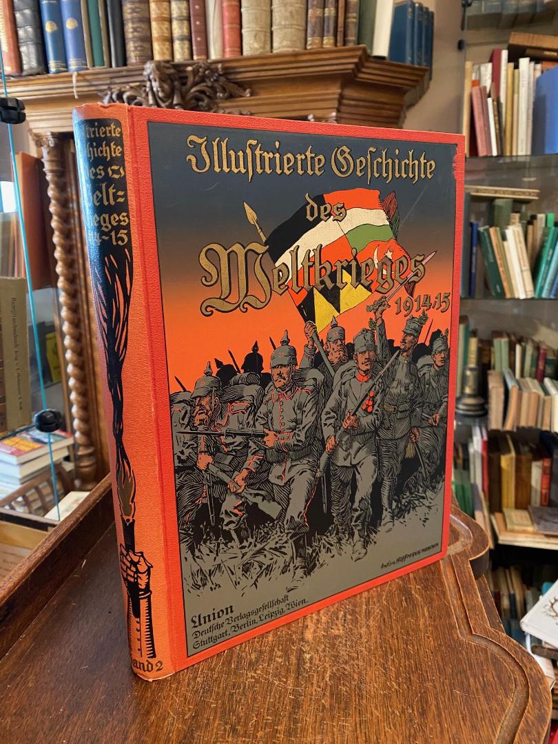 Illustrierte Geschichte des Weltkrieges 1914/15 (bzw. 1914/16 1914/17 1914/18) [in neun Bänden] : hier nur BAND 2 (apart). Band 2 von 9, Stuttgart; Berlin, Leipzig; Wien, UDV Union Deutsche Verlagsgesellschaft, [1915]. 4° (32x24), IV, 500 S., 2 Bl., reich illustriert mit TextAbb., teils doppelseitigen farb Kunstbeilage und Karten, roter Oln mit geprägtem farb Deckelbild, Wappen-SchmuckVorsätze, minimal lichtverfärbt, kaum gelesen, fest und sauber, gutes Exemplar, Einbandillustration von Anton Hoffmann.–