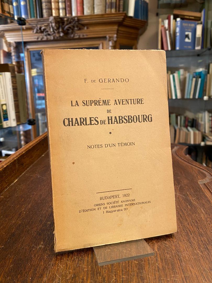 Karl I. Erzherzog von Österreich (1887-1922). – Gerando, F. de: La Supreme Aventure de Charles de Habsbourg : Notes d’un Temoin. Budapest, Oriens Societe Anonyme d’Edition et de Librairie Internationales / Victor Hornyanszky (impr), 1922. 8° (19x12), 94 p., reliure d’editeur souple, jauni, propre,