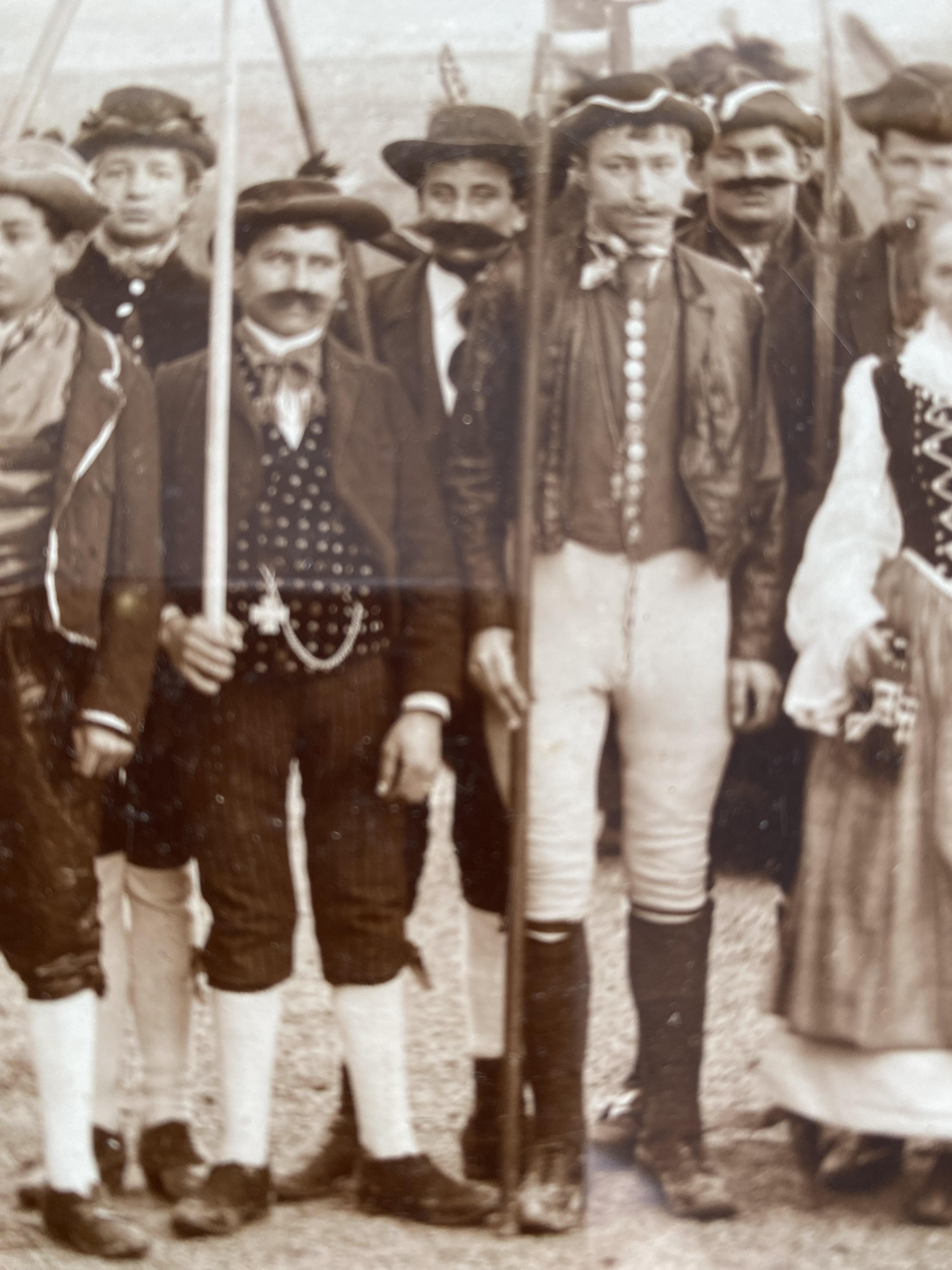 Saulgau, Bad – Fasnet. – Personengruppe der Saulgauer Fasnet 1896 : rückseitig bezeichnet ‚Franzosen-Samstag : Zur Erinnerung an die Fastnacht 1896‘ : querformatige Albuminfotografie von Franz J. Mock, Photograph Buchau a/F[edersee] auf Trägerkarton montiert, unten rechts blindgeprägter Fotografenstempel, alt unter Glas gerahmt. Saulgau, 1896. 15.5 x 28 cm (Foto), lackierter Holzrahmen mit Silberleiste 27 x 39 cm, Rahmen minimal bestossen, Trägerkarton minimal stockfleckig, Glas wurde gereinigt und mit dem Originalmaterial wieder verschlossen, veröffentlicht in der Saulgauer Heimatliteratur.– Personengruppe aus dem Historischen Festzug / Fastnachtsumzug im Jahr 1896.–
