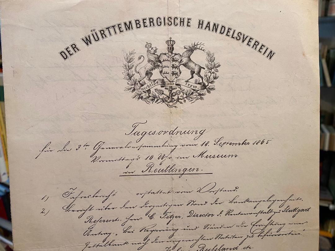 Reutlingen. – Ausschuss des württembergischen Handelsvereins: Der Württembergische Handelsverein : Tagesordnung für die 3te Generalversammlung vom 18. September 1865, vormittas 10 Uhr im Museum in Reutlingen. (Doppelseitiges Programm in typographischer Handschrift). Beliegend: Handschriftliches Referat von G. F. Staib aus Ravensburg zu Punkt 3.) Handelsverträge mit Italien, Russland etc. Reutlingen, 1865. 4° (32x21), Doppelblatt mit Wappenkopf des Württembergischen Handelsvereins mit Typokript, sowie 2 Blatt Handschrift, Ephemera zur Geschichte des Vorläufers der IHK Reutlingen: