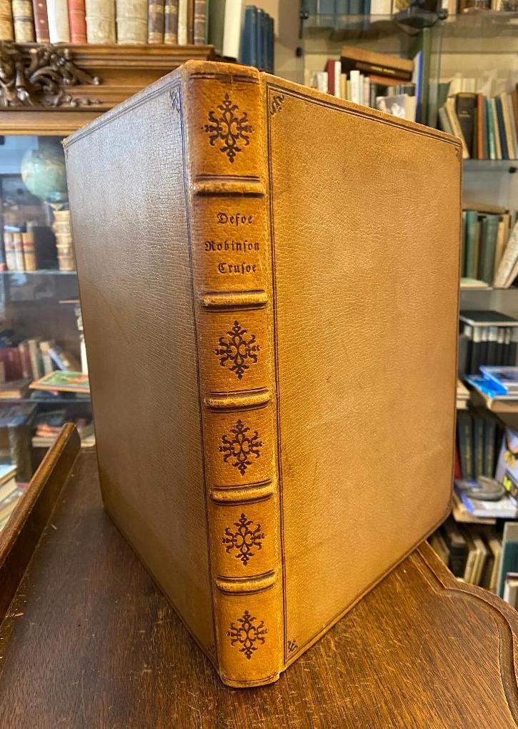 Defoe, Daniel (Text) / Heubner, [Friedrich] (Ill): Robinson Crusoe : Mit 20 Originalradierungen von F. Heubner. München, Der Bücherwinkel, 1922. 4° (32x26), 3 Bl., 239 S., 3 Bl., mit typographischen Titel, radierten iilustierten und signierten Titel und weiteren 20 signierten Radierungen, sowie jeweils einer radierten Anfangs- und Schlußvignette, brauner Oldr (Franzband) auf 5 Bünden, Deckelfiletten, kleine Eckfleurons, reiche RückenPrägung, KopfgoldSchnitt, braune Büttenvorsätze, gering berieben, Büttenrand gebräunt, insgesamt etwas angestaubt, sauberes gepflegtes Exemplar, [= Drucke des Bücherwinkels; 1], [Rodenberg 350].– mit 21 handsignierten Radierungen
