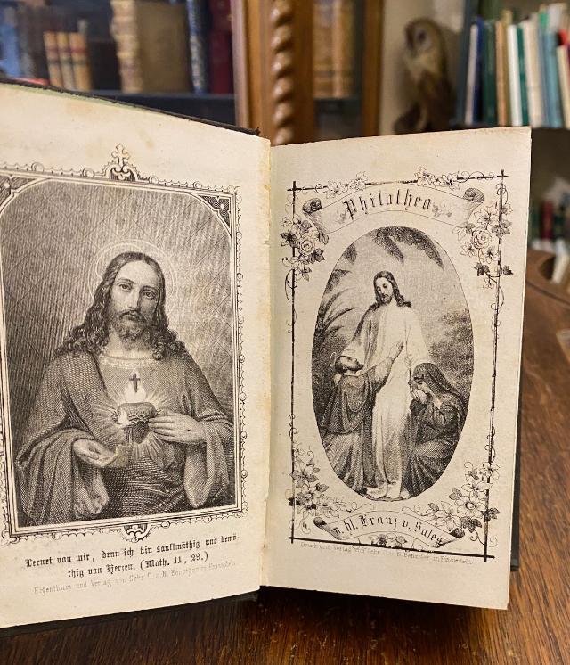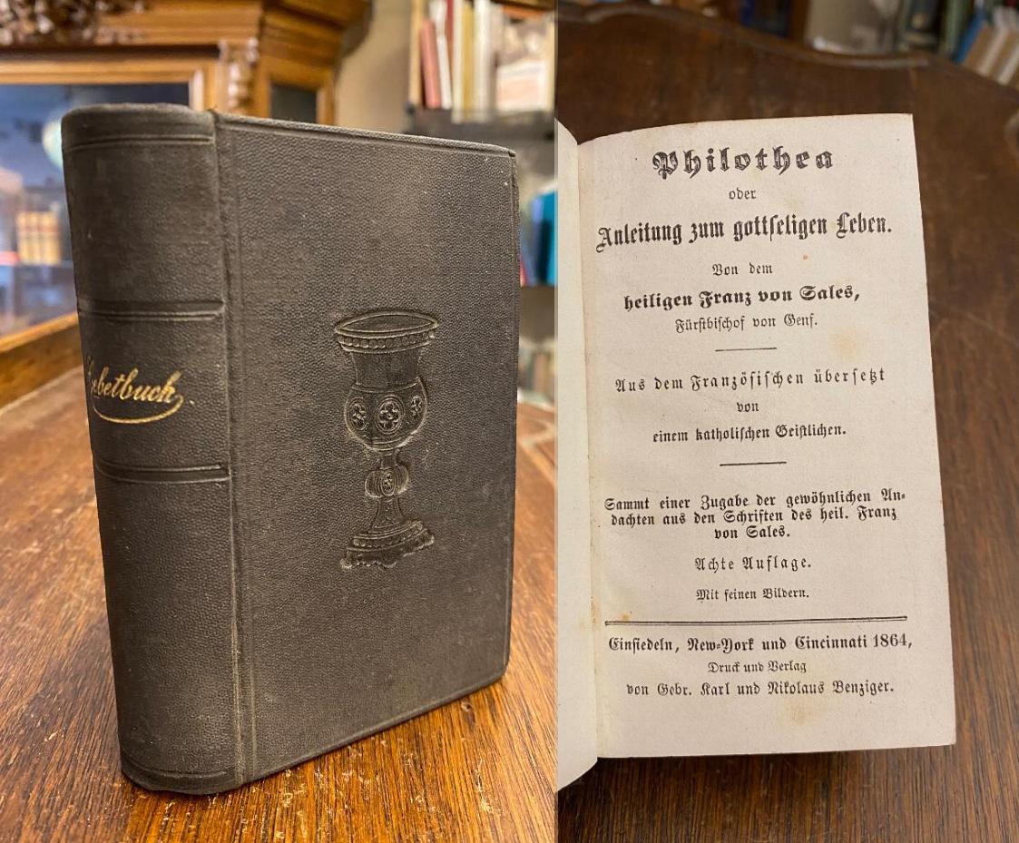 Sales, Franz von: Philothea – oder Anleitung zum gottseligen Leben. Von dem heiligen Franz von Sales, Fürstbischof von Genf. Aus dem Französischen [Introduction a la Vie Devote] übersetzt von einem katholischen Geistlichen. Samt einer Zugabeder gewöhnlichen Andachen aus den Schriften des heil. Franz von Sales. 8. Aufl., Einsiedel; New York; Cincinnatik, Verlag von Gebr. Karl und Nikolaus Benziger, 1864. 12° (12x8), 576 S., mit doppeltem Frontispiz, und weiteren 4 Tafeln, schwarzer Oln mit blindPrägung auf Deckel (Kelch) und goldRückentitel, marmorierter Schnitt, gutes gepflegtes Exemplar,