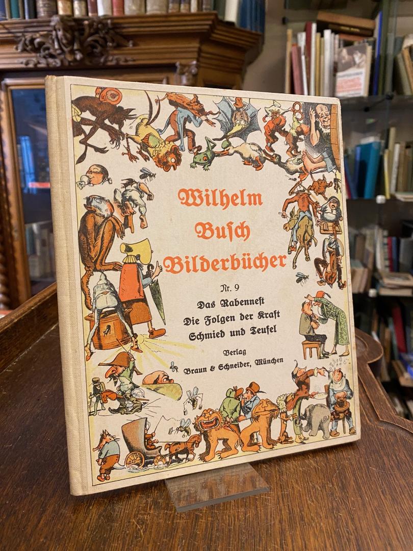 Busch, Wilhelm. Wilhelm Busch Bilderbücher Nr. 9: Das Rabennest – Die Folgen der kraft – Schmied und Teufel. München, Manuldruck Verlag Braun & Schneider, [1934]. 8° (22x18), 24 S., Bildergeschichten mit begleitenden Versen, farb ill OHln, sauber und gepflegt, enthält: Die Apfeldiebe.– Der faule Sepp und der fleißige Hans.– Bestrafter Mutwille.–