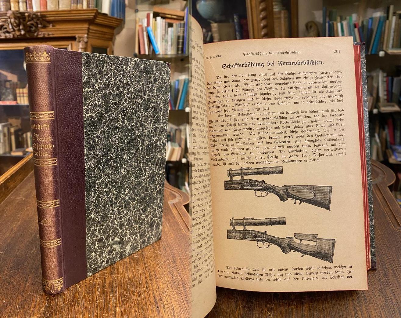 Jagdschutz Jg 1906. – Monatshefte des Allgemeinen Deutschen Jagdschutz-Vereins und der Deutschen Versuchs-Anstalt für Handfeuerwaffen : Jg. 11 : 1906 : Heft 1 (Januar 1906) bis Nr. 24 (Dezember 1906). Berlin, August Scherl, 1906. 8° (22x15), V, 410, 29 S., 1 Bl., mit Abb., Hln d.Zt. mit goldRTitel, dreiseitiger Rotschnitt, SchmuckVorsätze, fest sauber und gepflegt, Monatshefte des Allgemeinen Deutschen Jagdschutz-Vereins und der Deutschen Versuchs-Anstalt für Handfeuerwaffen; Jg. 11 : erschienen 1895-13.1908 : fortgesetzt u.d.T. Zeitschrift des Allgemeinen Deutschen Jagdschutz-Vereins : erschienen 14.1909-1920], kompletter Jahrgang in 24 Heften, durch Jahresregister erschlossen.–