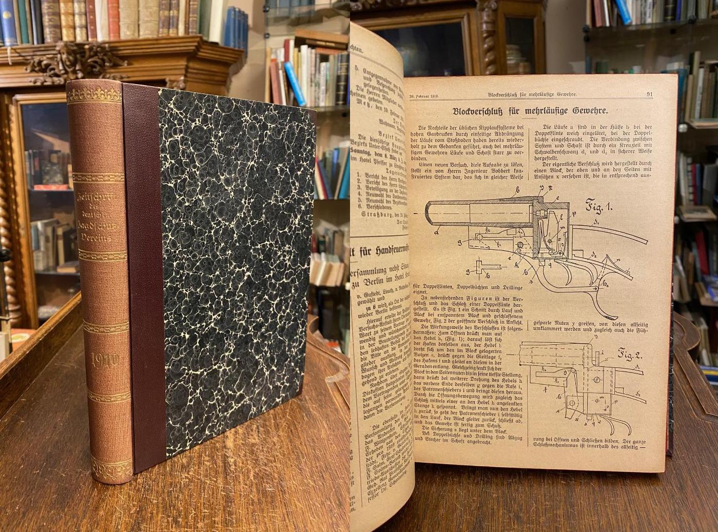 Jagdschutz Jg 1910. – Zeitschrift des Allgemeinen Deutschen Jagdschutz-Vereins, sowie der Deutschen Versuchs-Anstalt für Handfeuerwaffen, der Delegierten-Commission und der Kurzhaar-Klubs Stammklub und Posen : Jg. 15 : 1910 : Heft 1 (Januar 1910 bis Nr. 53 (Dezember 1910) ohne Heft 42. Berlin, Borussia Druck- und Verlags-Anstalt, 1910. 4° (26x19), IV, S. 1 – 442, [455] – 600, mit Abb., mit Beilge ausserhalb der Paginierung, Hln d.Zt. mit goldRTitel, dreiseitiger Rotschnitt, SchmuckVorsätze, fest sauber und gepflegt, Monatshefte des Allgemeinen Deutschen Jagdschutz-Vereins und der Deutschen Versuchs-Anstalt für Handfeuerwaffen; Jg. 15 : erschienen 1895-13.1908 : fortgesetzt u.d.T. Zeitschrift des Allgemeinen Deutschen Jagdschutz-Vereins : erschienen 14.1909-1920], nahezu kompletter Jahrgang in 52 (von 53) Heften, durch Jahresregister erschlossen.– es fehlt Heft 42.–