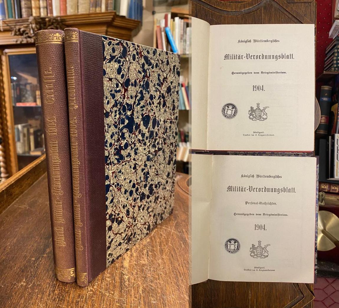 Militär-Verordnungsblatt, Königl. Württembergisches 1904. – Kriegsministerium (Hrsg): Königlich Württembergisches Militär-Verordnungsblatt 1904 [in zwei Bänden]: [Erlasse] Nr. 1 – 37 + Personal-Nachrichten Nr. 1 – 28 [so komplett]. 2 Bände in 2, Stuttgart, Druckerei des K. Kriegsministeriums, 1904. 8° (23x20), XV, 308; XII, 98 S., marmor Hln d.Zt. mit goldRückenPrägung, dreiseitiger Rotschnitt, ohne Gebrauchsspuren, offensichtlich ungelesen, frisch, [= Königlich Württembergisches Militär-Verordnungsblatt : Erlasse + Personalia; 1904 : erscheinungsweise 1857 – 69.1919], kompletter Jahrgang, jeweils durch Register erschlossen.–