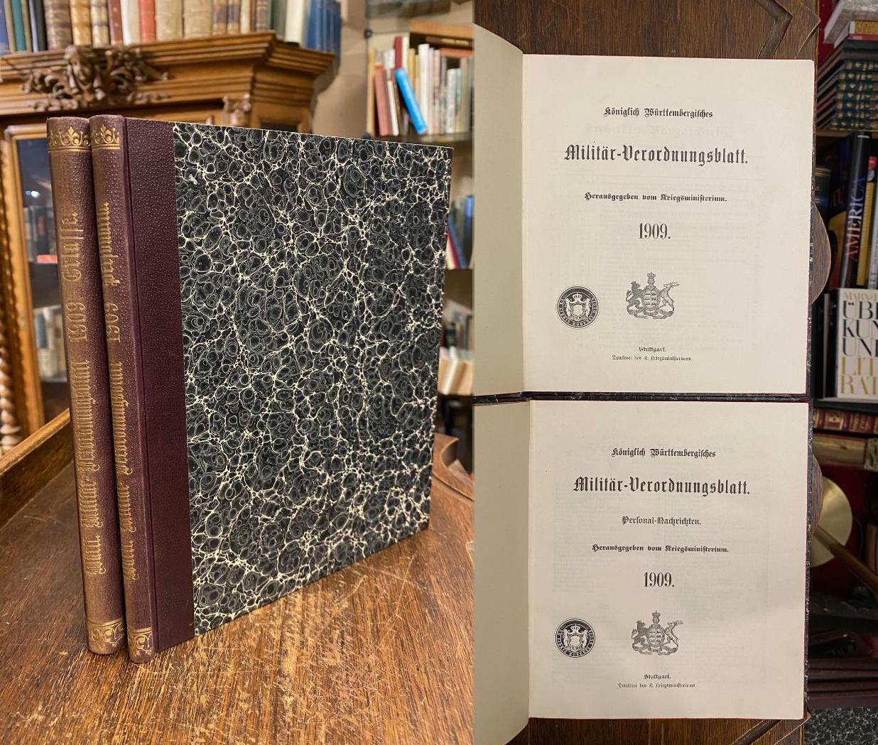 Militär-Verordnungsblatt, Königl. Württembergisches 1909. – Kriegsministerium (Hrsg): Königlich Württembergisches Militär-Verordnungsblatt 1909 [in zwei Bänden]: [Erlasse] Nr. 1 – 43 + Personal-Nachrichten Nr. 1 – 39 [so komplett]. 2 Bände in 2, Stuttgart, Druckerei des K. Kriegsministeriums, 1909. 8° (23x20), XXII, 262; XVII, 134 S., marmor Hln d.Zt. mit goldRückenPrägung, dreiseitiger Rotschnitt, ohne Gebrauchsspuren, offensichtlich ungelesen, frisch, [= Königlich Württembergisches Militär-Verordnungsblatt : Erlasse + Personalia; 1909 : erscheinungsweise 1857 – 69.1919], kompletter Jahrgang, jeweils durch Register erschlossen.– das letzte Blatt Nr.43 lose beiliegend, nicht eingebunden.–