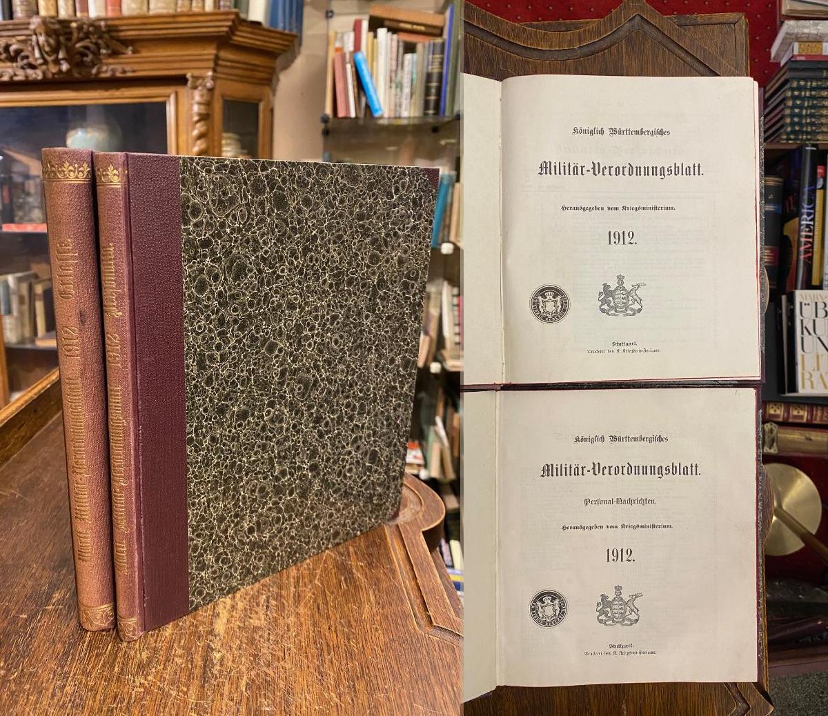Militär-Verordnungsblatt, Königl. Württembergisches 1912. – Kriegsministerium (Hrsg): Königlich Württembergisches Militär-Verordnungsblatt 1912 [in zwei Bänden]: [Erlasse] Nr. 1 – 40 + Personal-Nachrichten Nr. 1 – 32 [so komplett]. 2 Bände in 2, Stuttgart, Druckerei des K. Kriegsministeriums, 1912. 8° (23x20), XXII, 340, XXIII; XV, 125 S., marmor Hln d.Zt. mit goldRückenPrägung, dreiseitiger Rotschnitt, ohne Gebrauchsspuren, offensichtlich ungelesen, frisch, [= Königlich Württembergisches Militär-Verordnungsblatt : Erlasse + Personalia; 1912 : erscheinungsweise 1857 – 69.1919], kompletter Jahrgang, jeweils durch Register erschlossen.– das letzte Personal-Blatt Nr. 32 lose beiliegend, nicht eingebunden.–