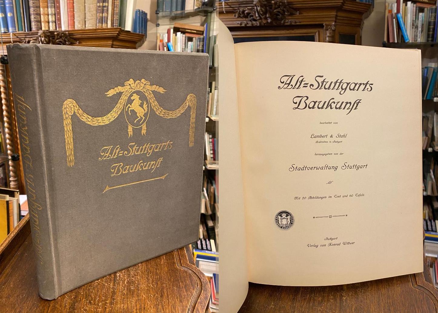 Stuttgart. – Lambert, Andre / Stahl, [Eduard] (Bearb): Alt-Stuttgarts Baukunst : Bearbeitet von Lambert & Stahl, Architekten in Stuttgart, herausgegeben von der Stadtverwaltung Stuttgart. Stuttgart, Verlag Konrad Wittwer, [1906]. 4° (35x30), 2 Bl., 28 S., mit 20 Abbildungen im Text und 60 Tafeln in Lichtdruck und Lithographie, grauer OSamteinband mit goldPrägung auf Deckel und Rücken, weisse MoireeVorsätze, dreiseitiger goldSchnitt, gering angestaubt, fest sauber und gepflegt, aus der Bibliothek Schloss Altshausen mit Papiersiegel-Exlibris von Robert Herzog von Württemberg.–