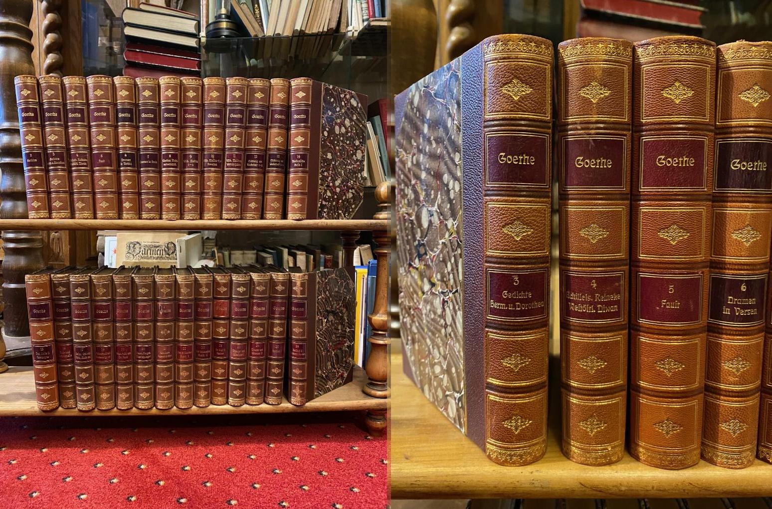 Goethe, Johann Wolfgang von (1749-1832). – Heinemann, Karl (Hrsg): Goethes Werke : [Grosse Ausgabe in 30 Bänden in Halbleder] : HIER NUR 27 von 30 Bänden : fehlt 1, 29, 30. Kritisch durchgesehene und erläuterte Ausgabe. 27 Bände (von 30), Leipzig; Wien, Bibliographisches Institut, (1901-1906). 8° (19x12), je Band ca. 450 – 550 S., braune OHldrbde mit LdrEcken, marmorBezug, KopfgoldSchnitt, kaum gelesen, geringe Gebrauchsspuren, schöne gepflegte Exemplare, [= Meyers Klassiker-Ausgaben : herausgegeben von Ernst Elster], [Sarkowski BI 22 a 12].–