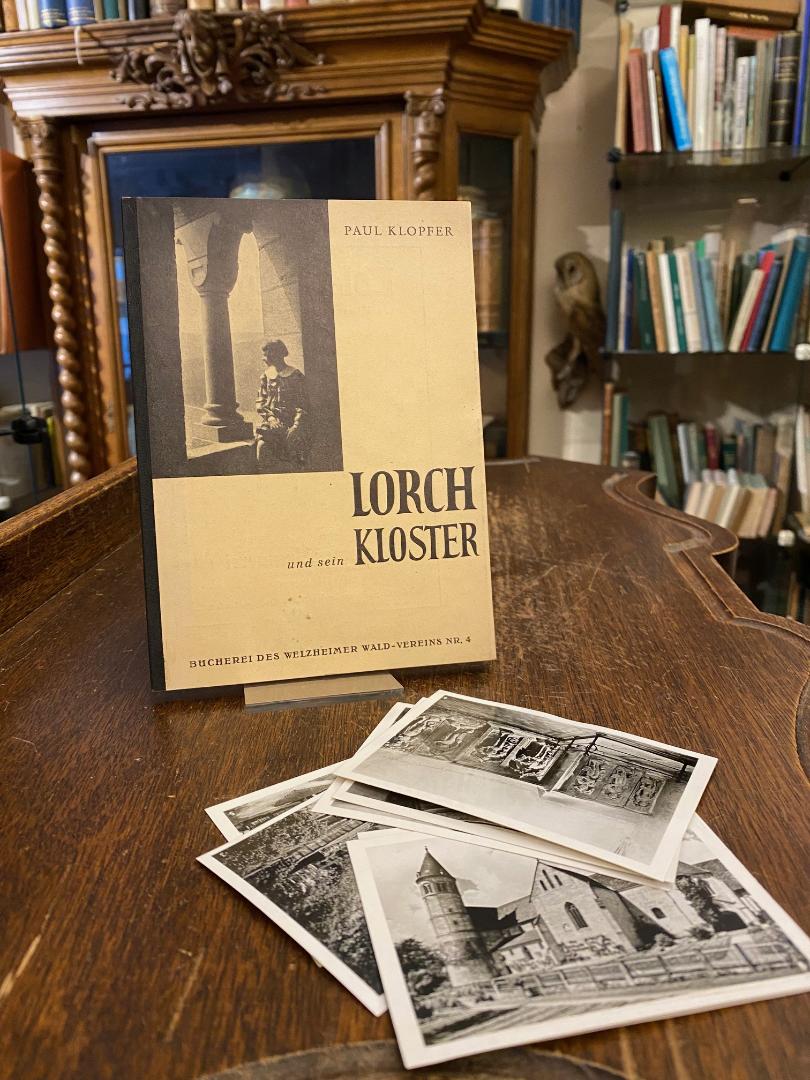 Lorsch. – Klopfer, Paul: Lorch und sein Kloster. Welzheim, Max Klaiber : Buchdruckerei und Zeitungsverlag, 1950. kl8°^(17x12), 93 S., 5 Bl. Werbeanhang, mit Plan und Abb., ill OKart (Brosch) mit Leinenrücken, ohne Gebrauchsspuren, offensichtlich ungelesen, sehr schön, [= Bücherei des Welzheimer Wald-Vereins : herausgegeben von Max Klaiber], beiliegend: 7 kleinformatige Originalfotografien des Klosters.–