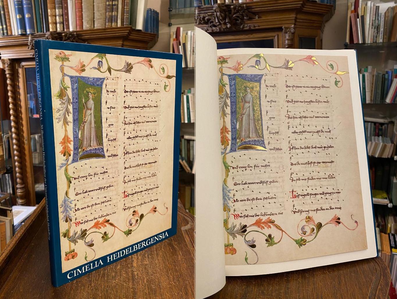 Werner, Wilfried (Ausw/Hrsg): Cimelia Heidelbergensia : 30 illuminierte Handschriften der Universitätsbibliiothek Heidelberg. Wiesbaden, Dr. Ludwig Reichert Verlag, (1975). 4° (34x25) 103 S., mit großformatigen teils farb Abb, 2 goldgehöhte Faksimile-Seiten mit Pergamin-Schutzblättern, blauer Oln mit goldPrägung mit ill OU, Umschlag rückseitig mit winziger Verletzung, sonst ohne Gebrauchsspuren, sehr schön.
