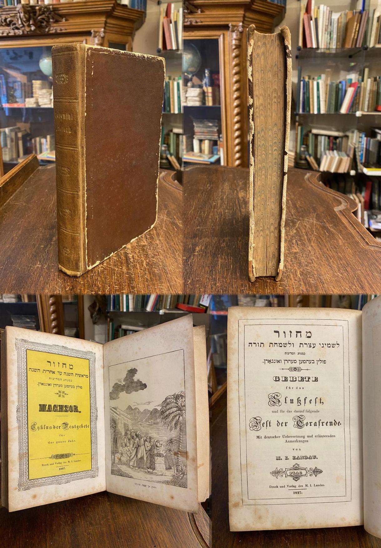 Landau, Moses I. (1788-1852): Machsor : Cyklus der Festgebete für das ganze Jahr : [wie es üblich ist in Polen, Böhmen, Mähren und Ungarn] : [Teil 6: Schemini – Azereth]: Gebete für das Slußfest [Schlußfest], und für das darauf folgende Fest der Torafreude. Mit deutscher Übersetzung und erlääuternden Anmerkungen von M. I. Landau. Prag, Druck und Verlag des M. I. Landau, 1847. 8° (22x14), 3 Bl. (Frontispiz, farb Vortitel, Titelblatt), 239 S., Hln d.Zt. mit goldRückentitel, Kanten stark bestossen, Papierrändert gebräunt, gutes festes Exemplar, Parallelausgabe hebräisch – deutsch.–