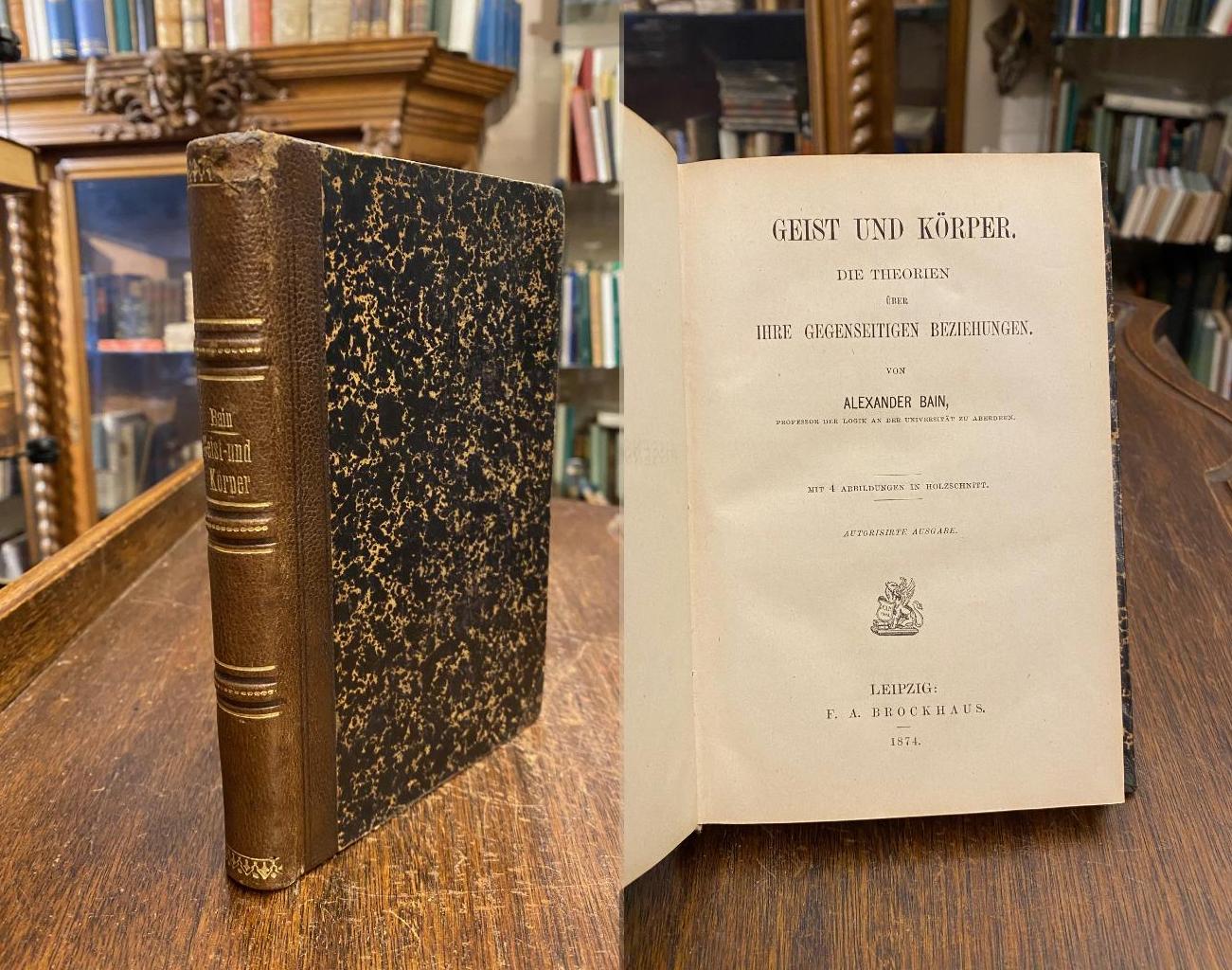 Bain, Alexander: Geist und Körper : Die Theorien über ihre gegenseitigen Beziehungen. Autorisierte Ausgabe. Leipzig, F.A. Brockhaus, 1874. 8° (18x12), 241 S., mit 4 Abb. in Holzschnitt, HLdr d.Zt. mit goldRückenPrägung, minimal berieben, leicht gebräunt, fest sauber und gepflegt, [= Internationale Wissenschaftliche Bibliothek; 3], Alexander Bain (1818-1903) schottischer Philosoph, Psychologe und Pädagoge, Professor der Logik an der Universität Aberdeen.–