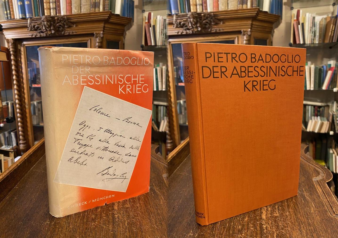 Badoglio, Pietro (Marschall von Italien / Herzog von Addis Abeba): Der Abessinische Krieg. Mit einem Vorwort von Benito Mussolini. Aus dem Italienischen (La Guerra d’Etiopia) von Eugen Dollmann. München, C.H. Beck’sche Verlagsbuchhandlung, 1937. gr8° (24x17), X, 215 S., mit 8 Abb. teils auf gefalteten Panoramatafeln, 3 teils gefaltete Faksimiles und 9 Kriegskarten, Oln mit OU, der Umschlag lichtrandig und mit säurefrei reparierten Randläsuren, sonst fest sauber und gepflegt,