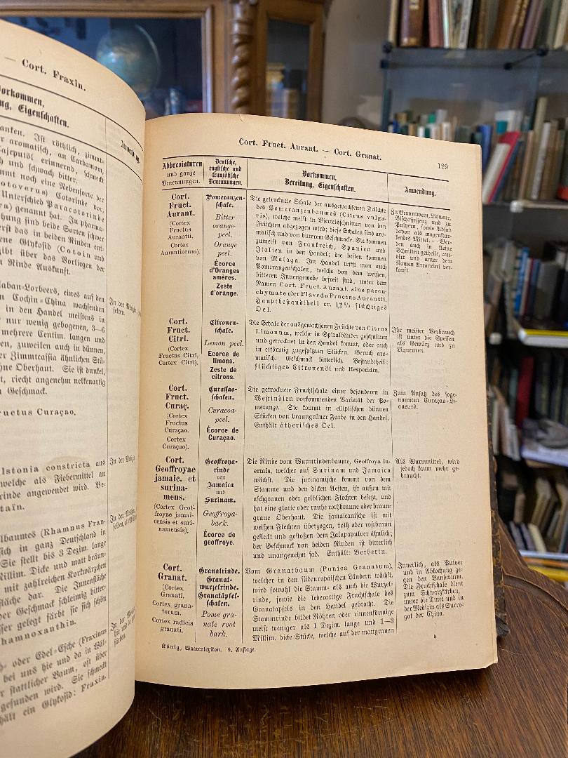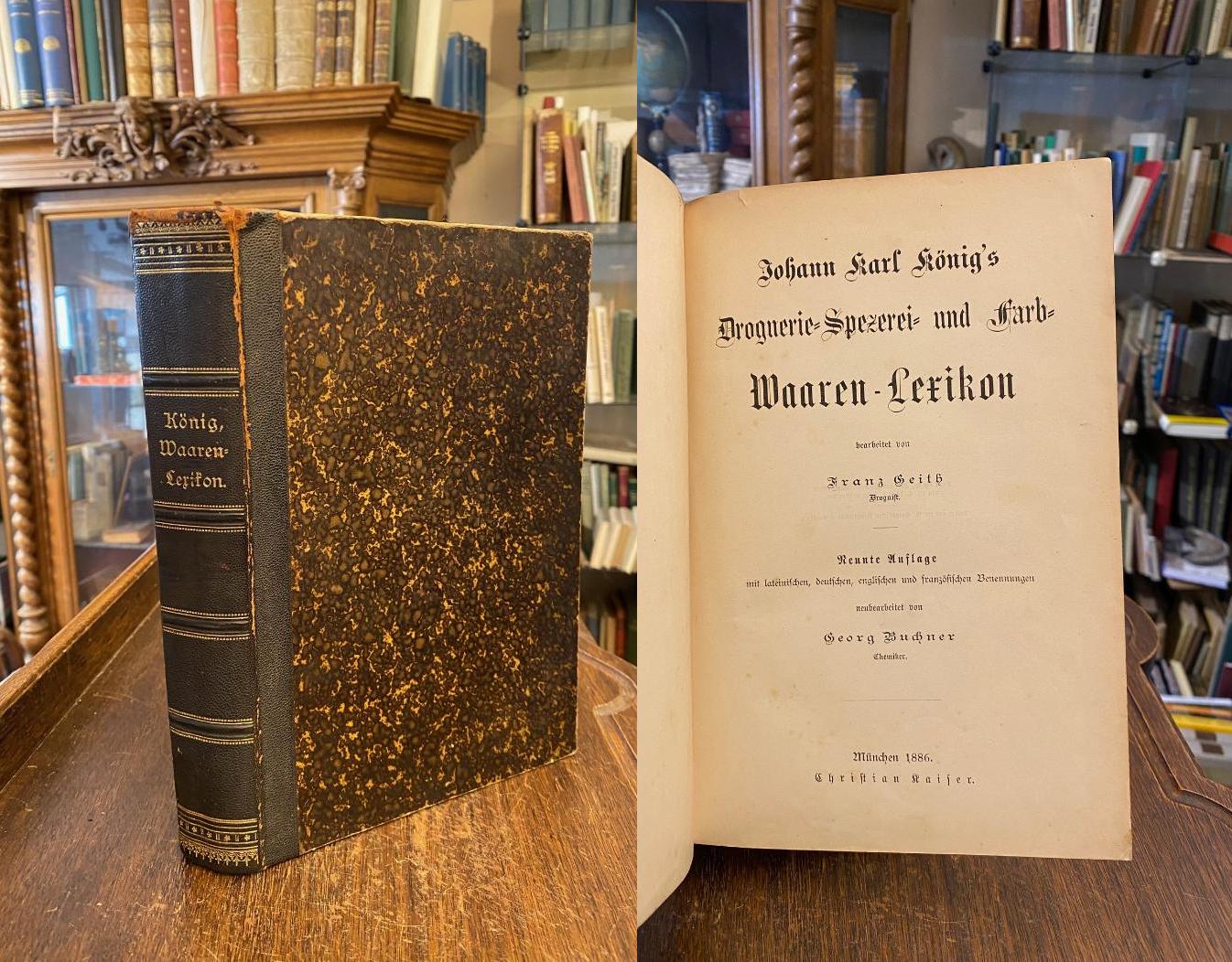 König, Johann Karl / Geith, Franz (Bearb) / Buchner, Georg (Bearb): Johann Karl König’s Droguerie-Spezerei- und Farb-Waaren-Lexikon. Berbeitet von Farnz Geith, Droguist. Neunte Auflage mit lateinischen, deutschen, englischen und französischen Benennungen neubearbeitet von Georg Buchner, Chemiker. 9., neubearbeitete Aufl., München, Christian Kaiser, 1886. 4° (25x17), (X), 570 S., 1 Errate-Bl., OHldr mit goldRückentitel, vord Rückenfalz etwas aufgeplatzt (Stabil), Kanten etwas bestossen, Vorsatz mit alten Besitzeinrägen, ordentliches Exemplar,