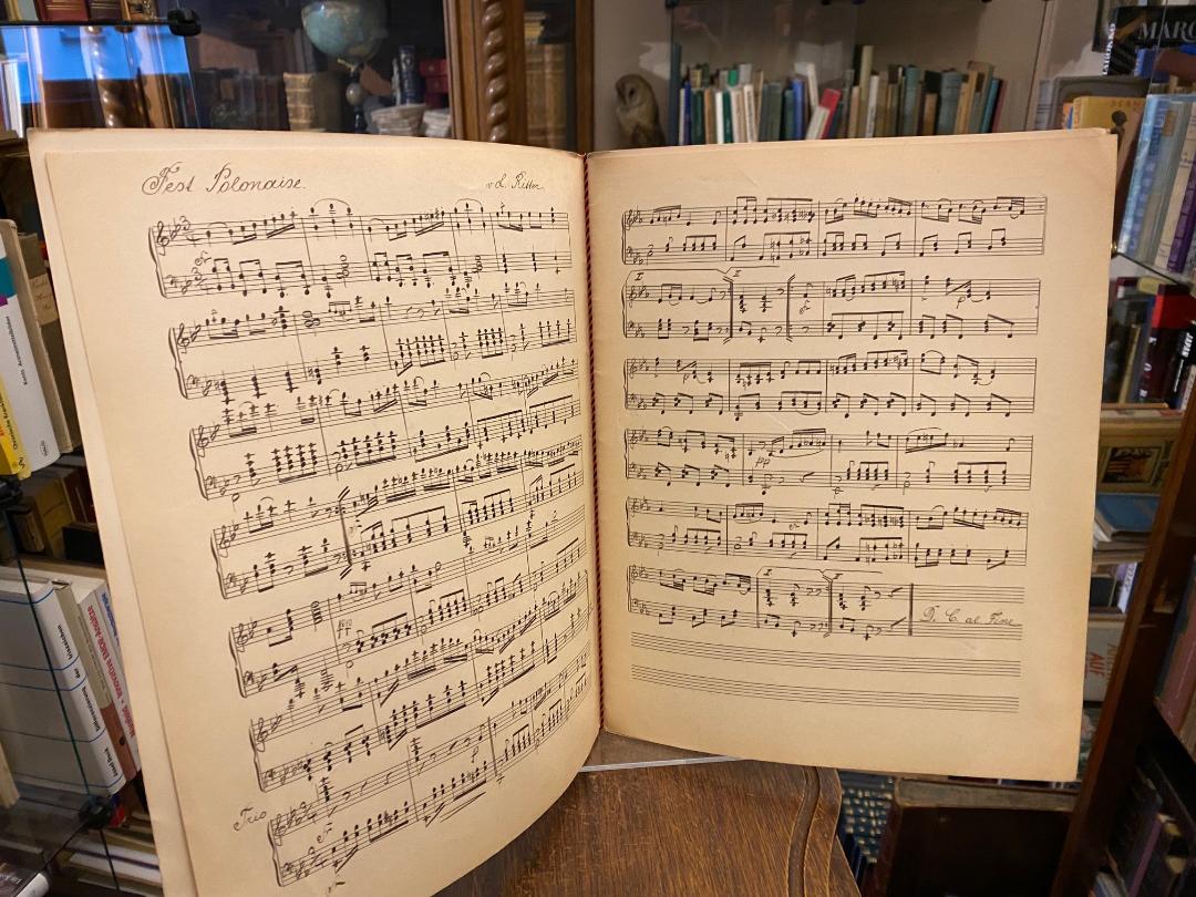 Ritter, Louis: Erinnerung an das schöne Vorarlgebirge (Austria) : Fest-Polonaise für das Pianoforte : Componiert von Louis Ritter, Professor. o. J. [um 1890]. 4° (33x27), Umschlag mit Titeldruck mit Kordel, enthaltend Doppelblatt mit handschriftlicher Original-Komposition, gering angestaubt, gutes Exemplar,