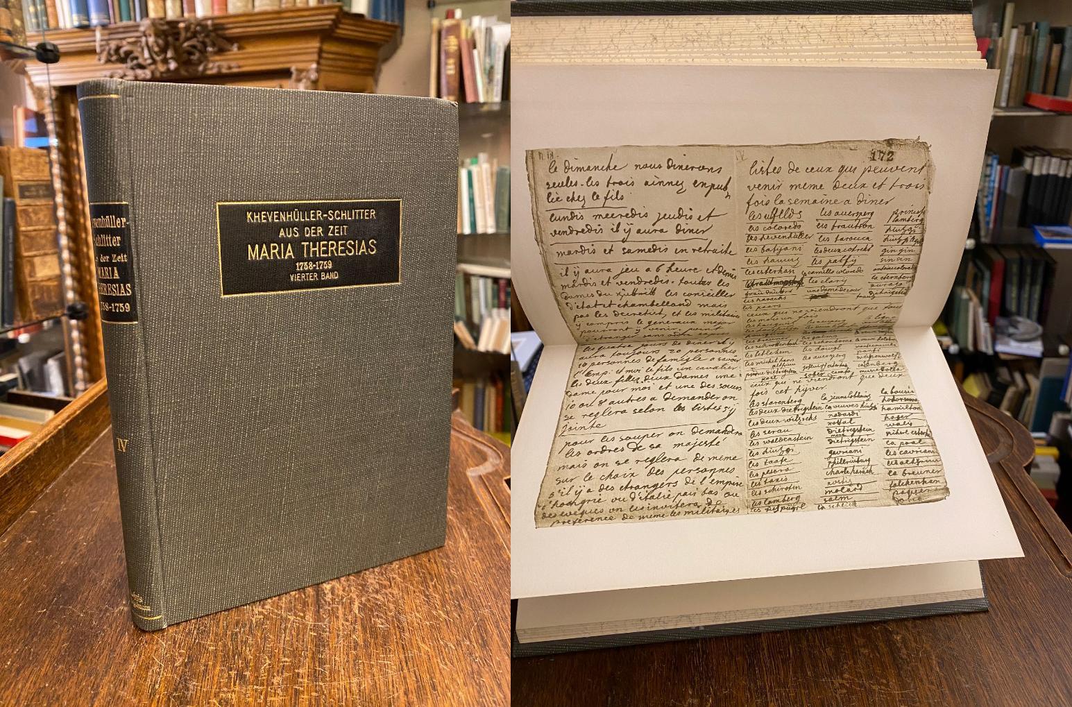 Maria Theresia, Römisch-Deutsches Reich, Kaiserin (1717-1780). – Khevenhüller-Metsch, Rudolf Graf / Schlitter, Hanns (Hrsg): Aus der Zeit Maria Theresias : Tagebuch des Fürsten Johann Josef Khevenhüller-Metsch, Kaiserlichen Obersthofmeisters 1742 – 1776 : BAND IV: 1758 – 1759. Band 4 von 8, Wien, Adolf Holzhausen / Leipzig, Wilhelm Engelmann, 1911. gr8° (24x16), (III), 313 S., mit doppelseitigem Faksimile, Oln gewachst mit geprägten Titelschildern, nahezu ungelesen, schönes gepflegtes Exemplar, [= Veröffentlichungen der Kommission für neuere Geschichte Österreichs],