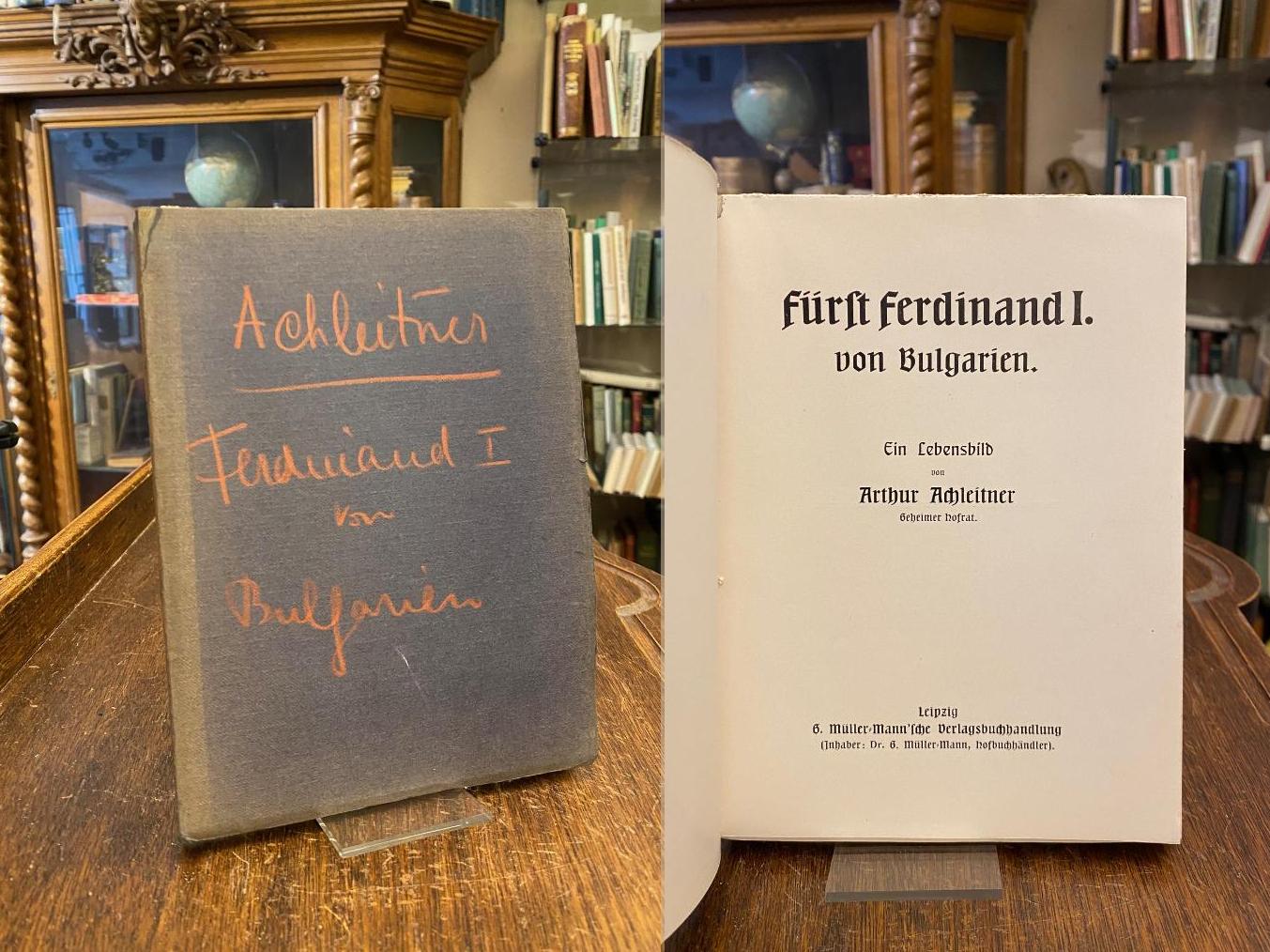Ferdinand I. Fürst und Zar von Bulgarien (1861-1948). – Achleitner, Arthur: Fürst Ferdinand I. von Bulgarien. Leipzig, G. Müller-Mann’sche Verlagsbuchhandlung (F. Müller-Mann, Hofbuchhändler), (1907). 8° (20x14), 151 S., schlichte OKart (Brosch), Umschlag etwas lichtverfärbt, vord Deckel mit handschriftl Titel, unbeschnitten/unaufgeschnitten, offensichtlich ungelesen,