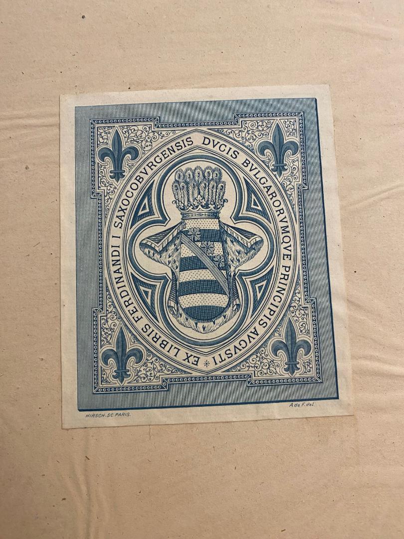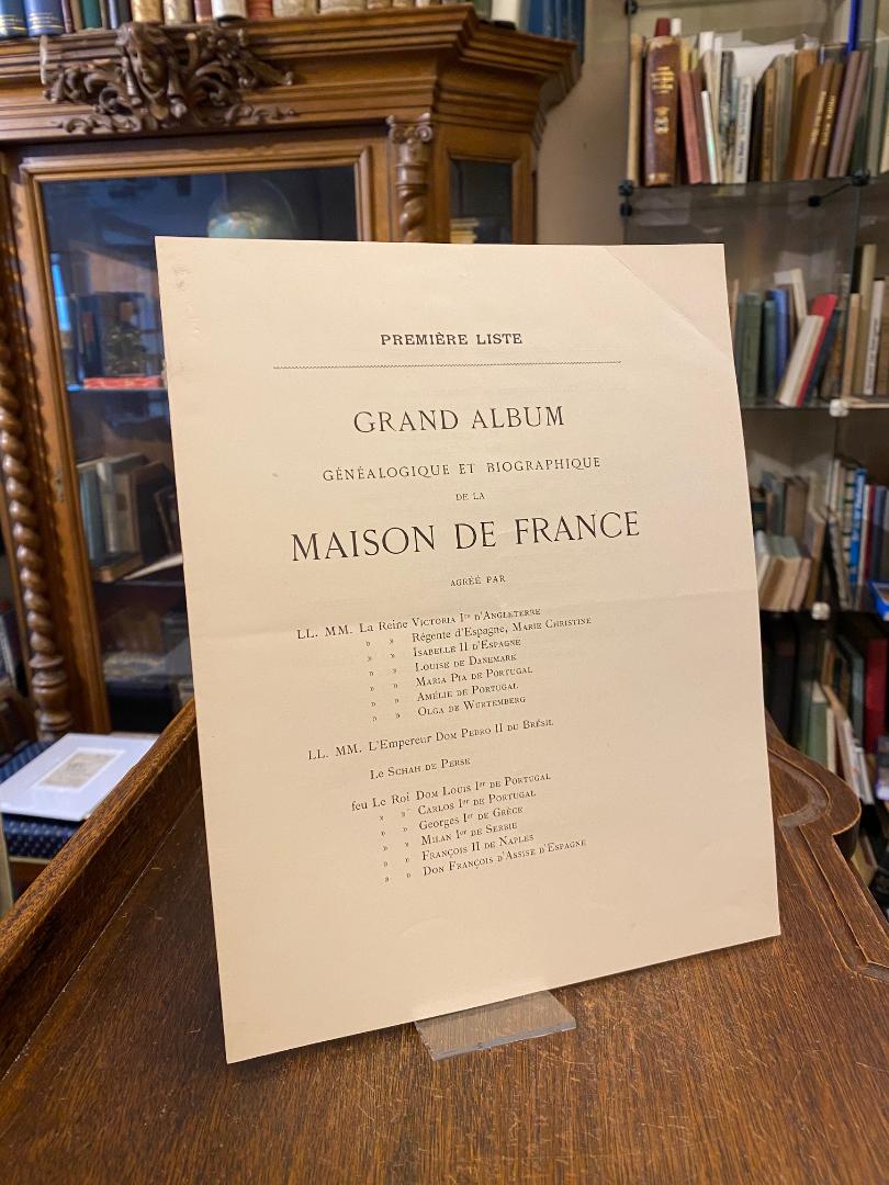 Dumax, [Victor-Alfred) (1827-1894): Grand Album Genealogique & Biographique des Princes de la Maison de Bourbon depuis ses plus ancienne origines et principalement depuis son avenement au Trone de France jusqu’au 31. Mai 1888, par l’abbe V. Dumax du Clerge de Paris. Paris, chez Blanc-Pascal : Imprimeur-Litographe, (1888). gr2° grand folio (48x32), [4], XII (4 plein page et 8 double page) tables genealogiques [ecris tout petit], 4, 67 p., entierement lithographie, reliure d’editeur demi toile avec piece de titre, peu frotte, les cois emousses, bon, de la possession de Ferdinand I. (1861-1948), dernier tsar de Bulgarie avec son ex libris (‚Ex Libris Ferdinande I Saxocoburgensis Ducis Bulgarorumque Principis Augusti‘ : Hirsch, Paris sc. / A. de F. del. / 12 x 10 cm)