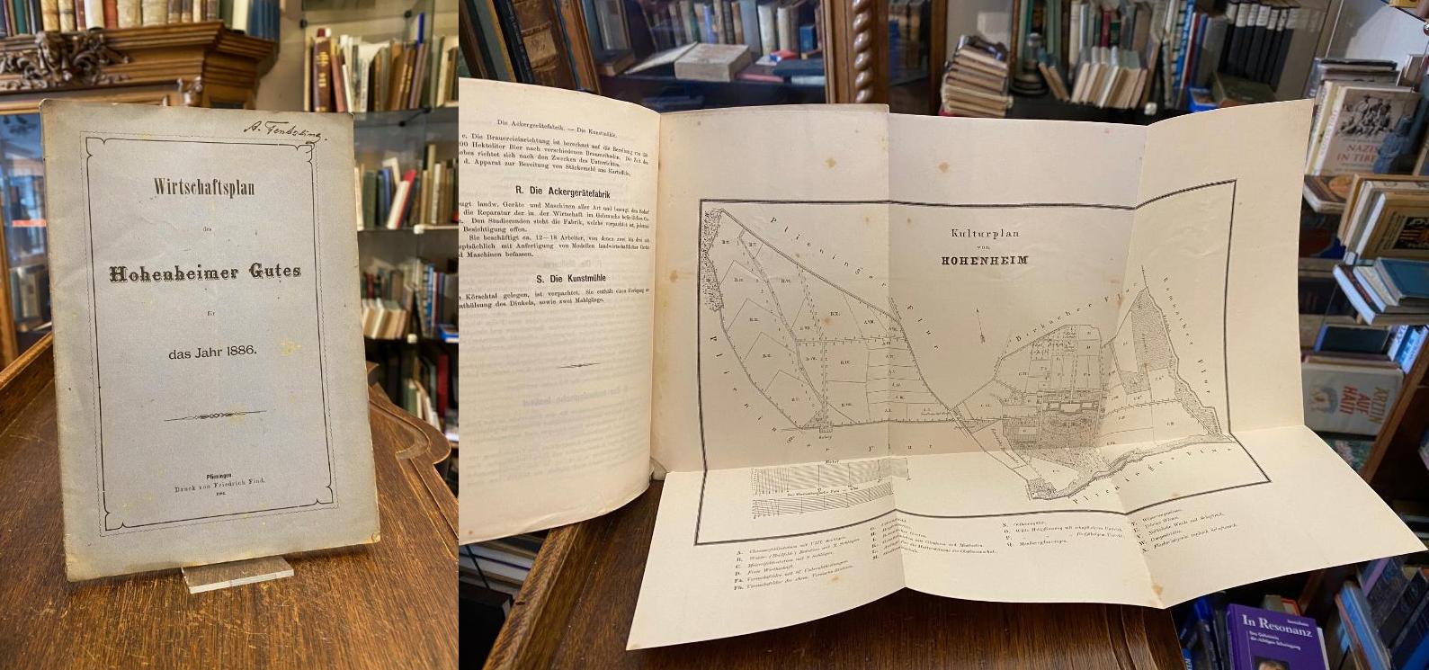 (Königlich Württembergische Landwirtschaftliche Akademie) (Hrsg): Wirthschaftsplan des Hohenheimer Gutes für das Jahr 1886. Plieningen, Druck von Friedrich Find, 1886. 8° (23x16), 30 S., mit 1 mehrfach gefalteten Plan (Kulturplan von Hohenheim), OKart (Brosch), alter Name auf Umschlag, etwas angestaubt und lichtverfärbt, gutes Exemplar,