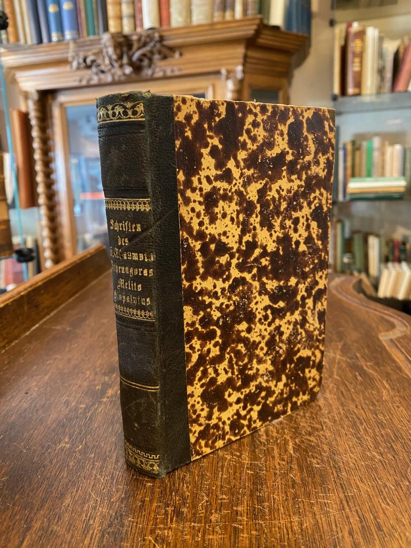BKV Reithmayr-Thalhofer Hldr. – Margraf, Joseph (I) / Bieringer, Aloys (II) / Gröne, Valentin (III/IV) (Bearb): (I) Ausgewählte Schriften des heiligen Gregorius Thaumaturgus nach dem Urtext übersetzt.+ (II) Die Schriften des christlichen Philosophen Athenagoras aus Athen.– (III) Melito’s des Bischofs von Sardes Rede an den Kaiser Antoninus, (über die Wahrheit,) übersetzt und mit Einleitungen versehen.– (IV) Hippolytus’ des Presbyters und Martyrers, Canones, übersetzt und mit Einleitungen vesehen. 4 Teile in 1 Band, Kempten, Verlag der Jos. Kösel’schen Buchhandlung, 1875-1875-1873-1874. kl8° (16x11), 84, 198, 63, 48 S., marmor Hldr mit goldRPräg, Vorsatz etwas staubstockfleckig, Papier gebräunt, sauber, [= Bibliothek der Kirchenväter; 28 : Auswahl der vorzüglichsten patristischer Werke in deutscher Übersetzung : herausgegeben 1869-88 in 80 Bänden unter der Oberleitung von Valentin Thalhofer / F.X. Reithmayr],